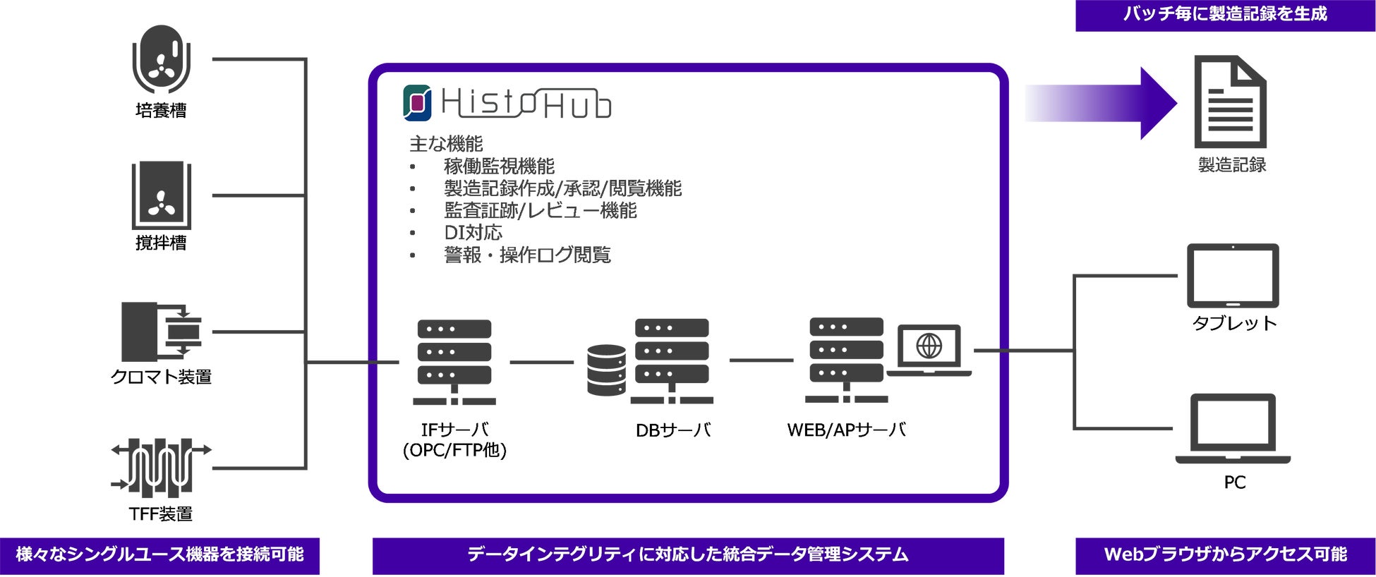なお、HistoHub®という名称は、バイオ医薬品製造に用いる複数のシングルユース機器の接続(Hub)と、製造データの時系列データベースシステム(Historian)への集約という、2つの特徴に由来しており、医薬品製造現場におけるデータ管理の新しいハブを目指しています。