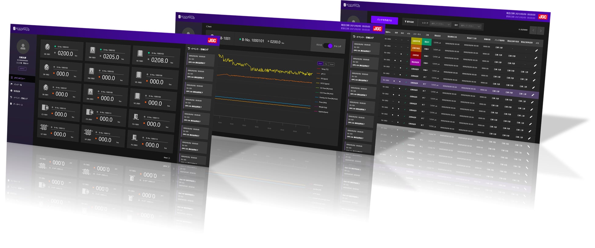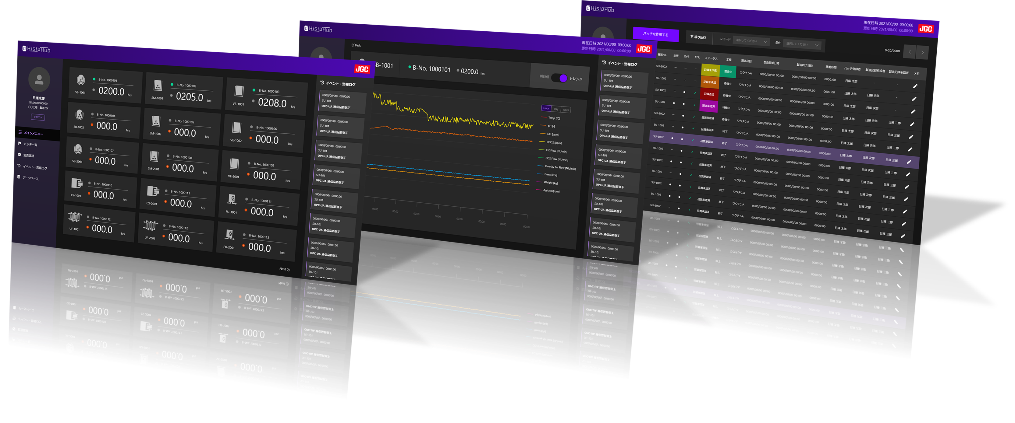 HistoHub®に登録した機器の稼働状況(運転中、警報有無、製造に使用されている場合はバッチ番号等)を機器ごとに一目で判別できるようにしています。PCあるいはタブレット画面を通じ、製造現場以外で稼働監視できるようにしています。