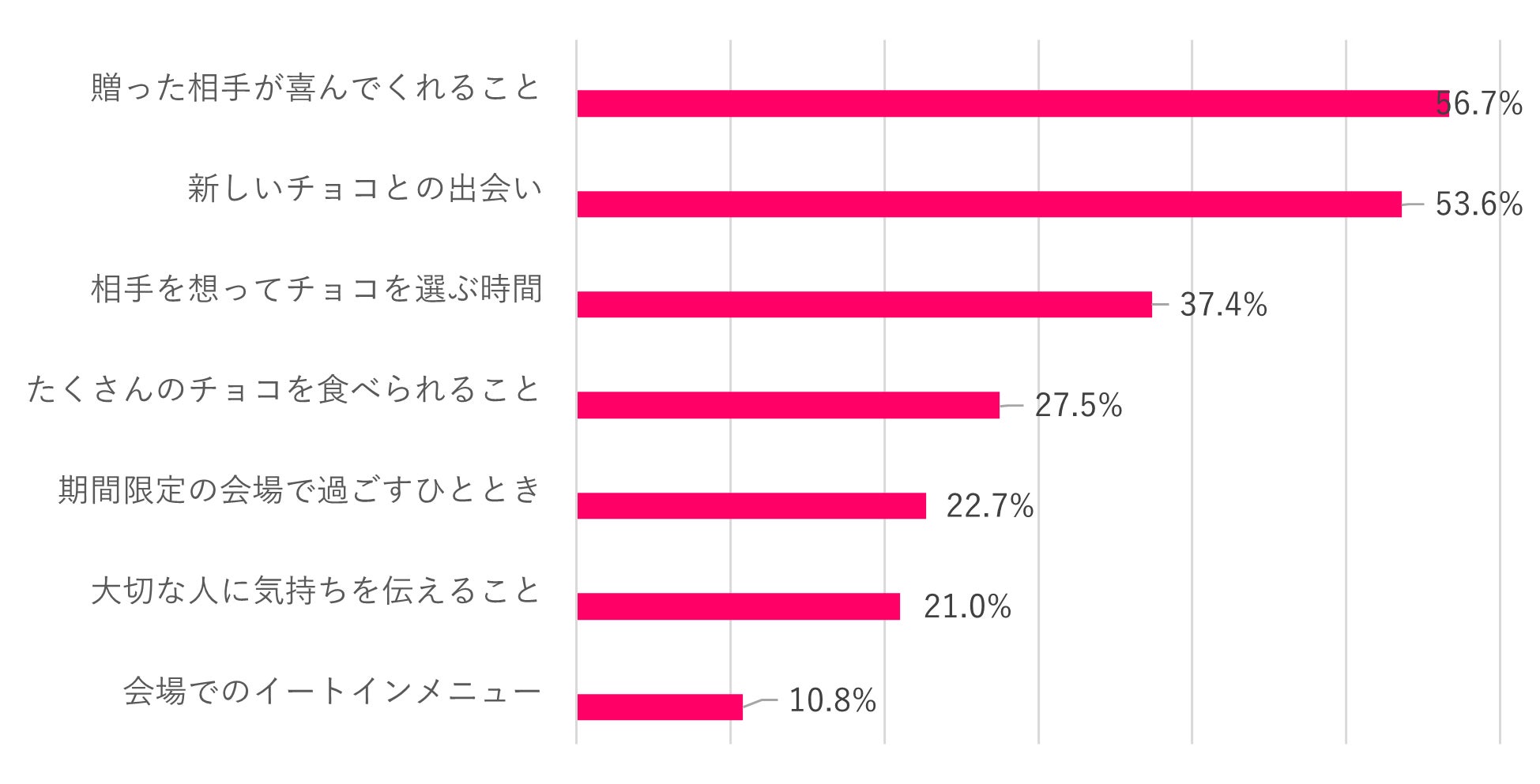 バレンタインの楽しみについて、多くはバレンタイン本来の意味である「贈った相手が喜んでくれること」や「大切な人に気持ちをつたえること」などと回答。そのなかで、Q1で「自分チョコ」を購入予定の人が多数いるという回答につながり、自身の「新しいチョコとの出会い」や「期間限定の会場で過ごすひととき」「会場でのイートイン」などを楽しみにしている人が多い結果となった。会場に行き、多くの体験を求める人が多いという象徴の表れと推測。