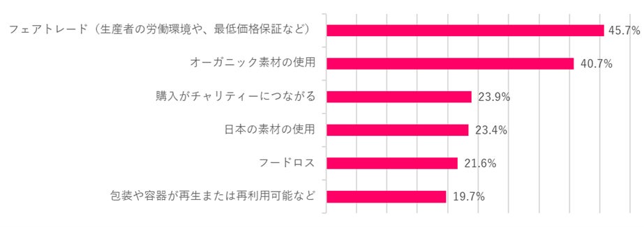サステナブルに関して約15%の人が「興味がない」と答えたものの、多くの人が何らかの関心があると回答。なかでも昨年に引き続き「フェアトレード」への関心が高い。その他「包装や容器が再生または再利用可能など」と答えた人も上位に。バレンタインのイベントやチョコレートを通して、サステナブルへの関心を高める機会になっていると推測する。