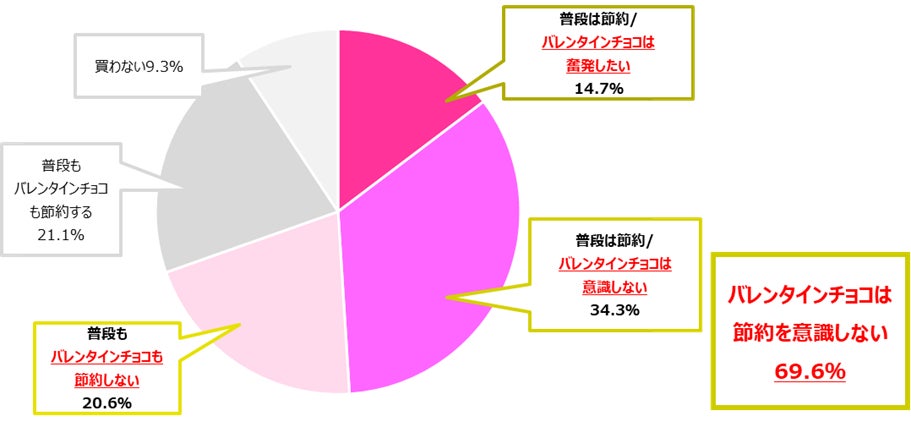 今年も引き続き物価高騰で節約志向の動きがみられる中、昨年バレンタインチョコの値上げを感じた人が約55%いた。ほかバレンタインチョコの節約に関して、全体の約7割はバレンタインチョコでの節約は意識せず、うち、約15%はバレンタインチョコは奮発したいと回答。バレンタインチョコの値上げを感じながらも、普段は節約をしつつ、バレンタインチョコは好きなもの・食べたいものを買いたいという回答が目立った。