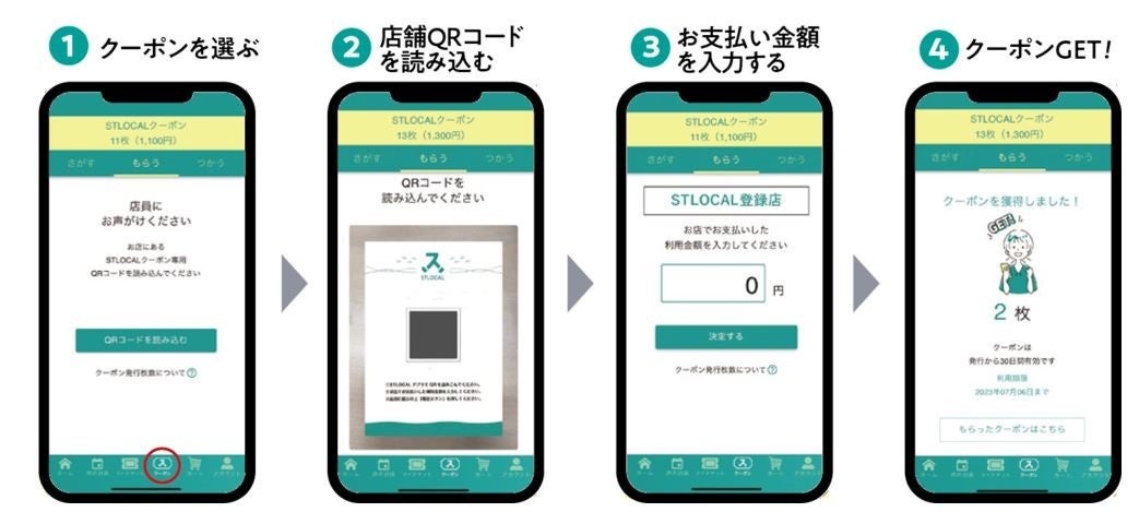 STLOCAL登録店にて1,000円以上のお支払いごとに100円分、最大5,000円以上のお支払いで500円分のクーポンが発行されます。