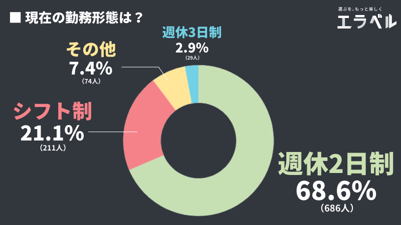 現在の勤務形態で最も多い回答は「週休2日制」68.6%でした。