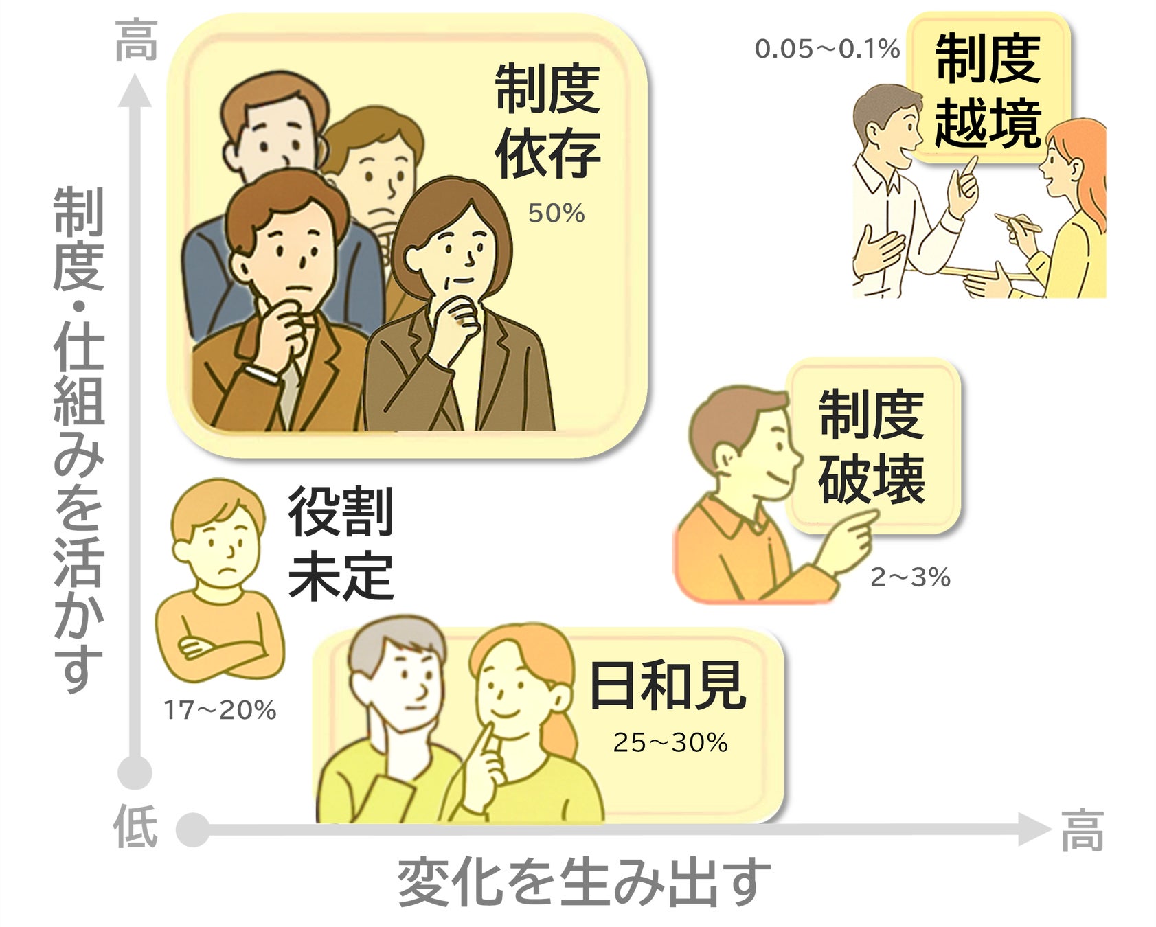 制度破壊型(2〜3%):現行制度の限界を打破し、新しい仕組みをつくる大胆な改革者
