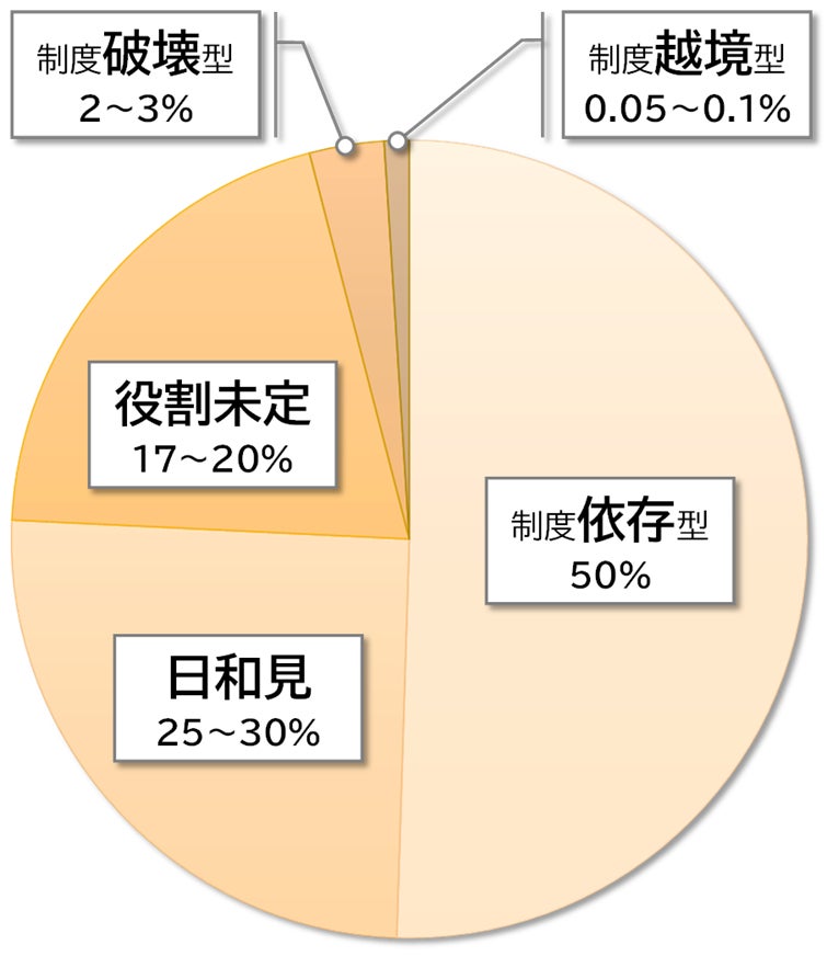 制度依存型(50%):制度内で成果を積み重ねる安定志向。外部変化への適応はやや遅い