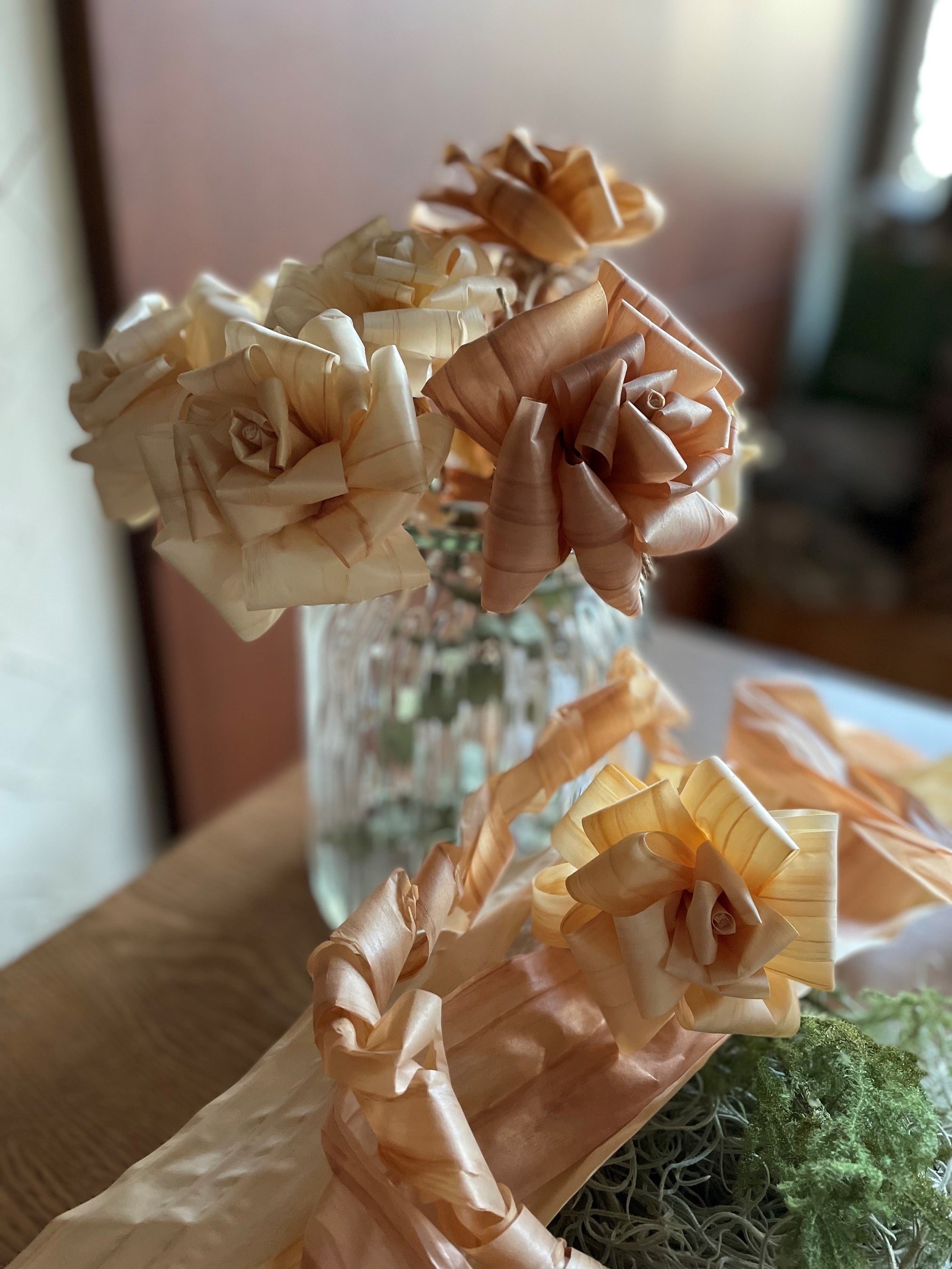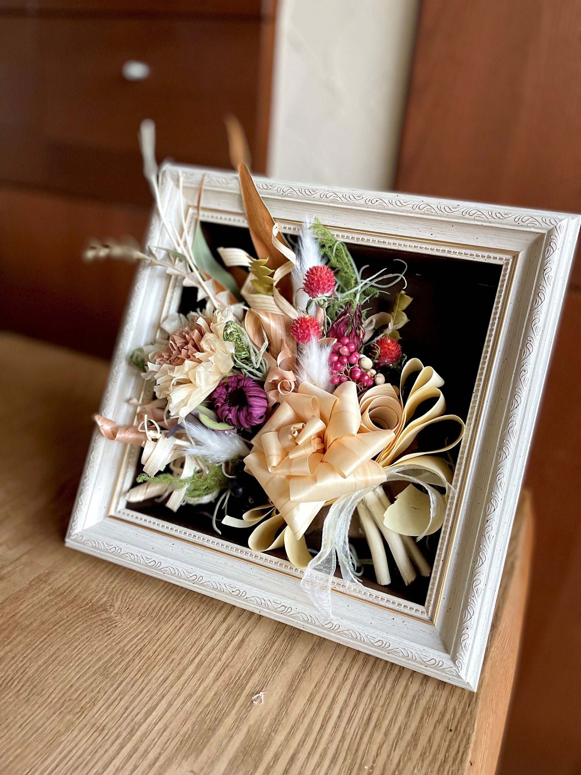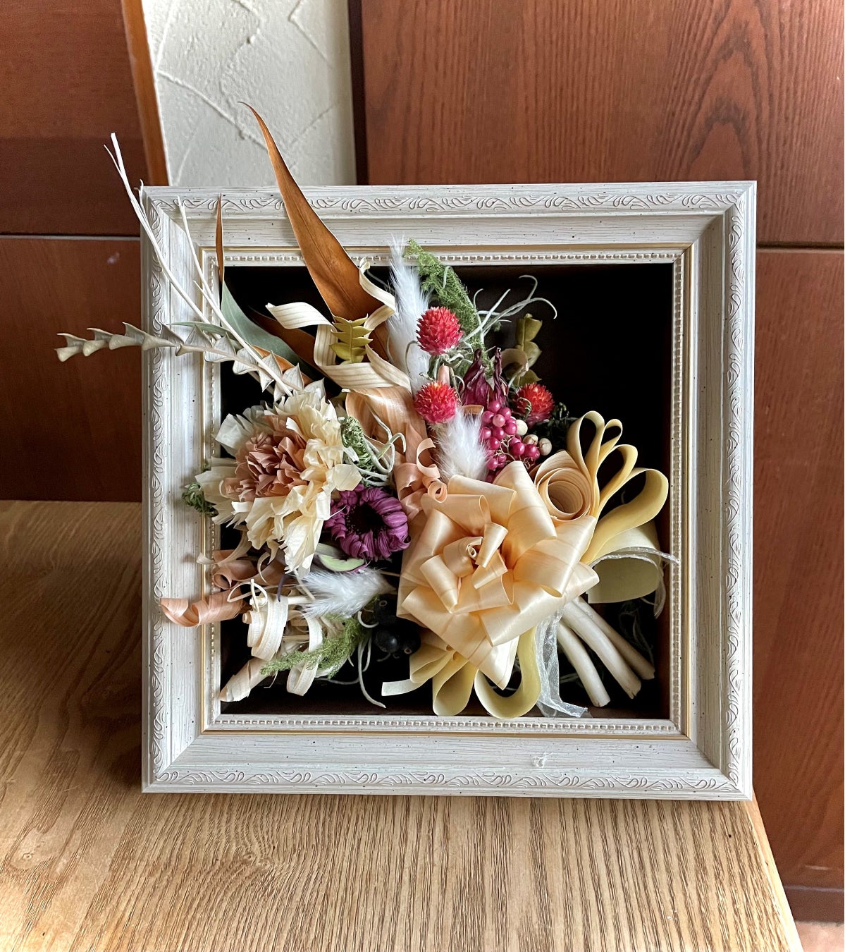 この職人が削るかんな屑を使って「廃材をアートに」をテーマに活動されているKo-hanaさんを講師にお招きして、ドライフラワーを添えて作品を仕上げていきます。