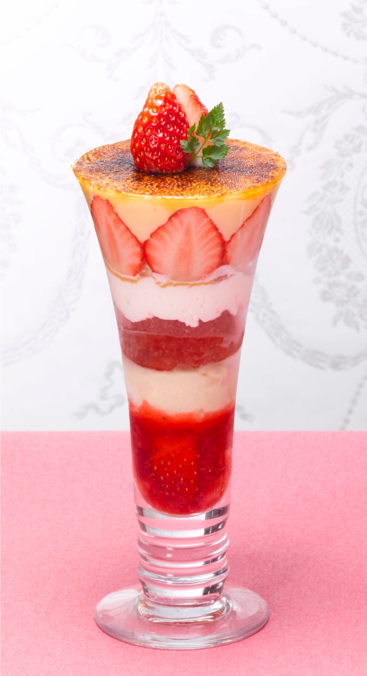 カリッと香ばしくキャラメリゼしたクレームブリュレに甘酸っぱい苺の味わいとピーカンナッツのアクセント。様々な素材が織りなす見た目も楽しいパフェです。