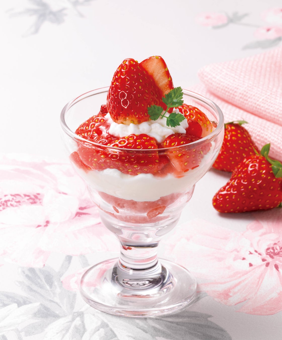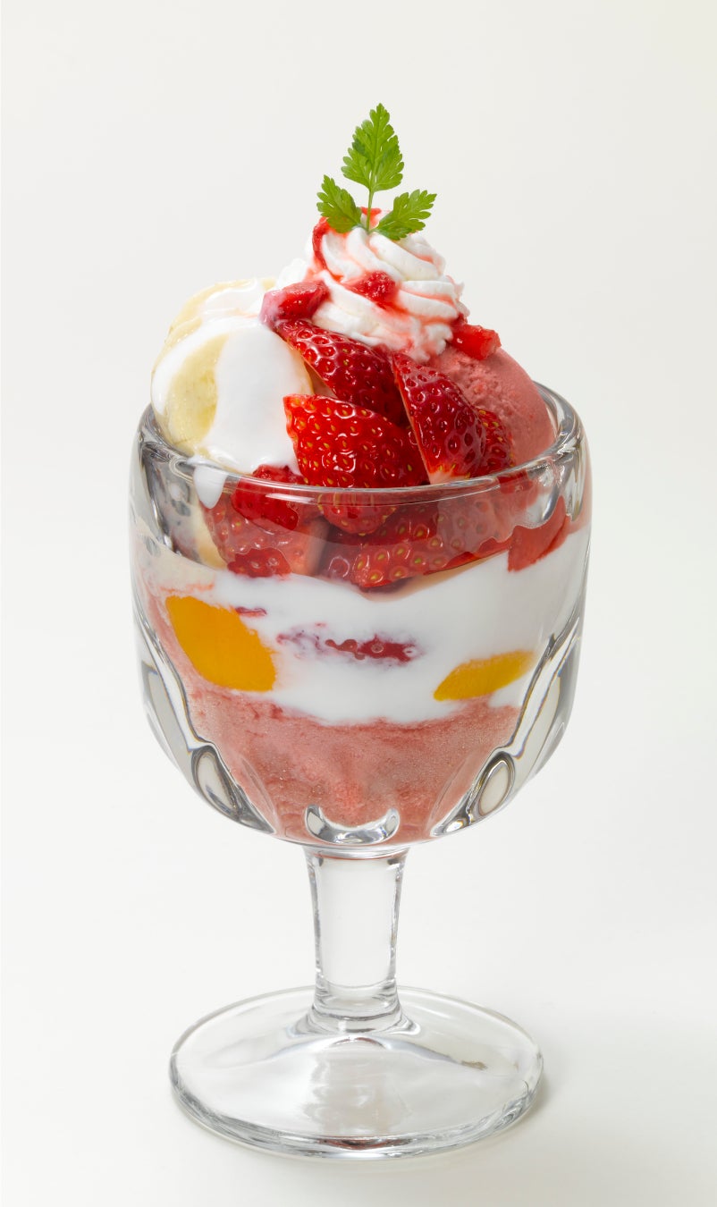 苺のソルベに、苺、バナナ、黄桃を合わせた、さわやかな甘酸っぱさが広がる季節限定ヨーグルトジャーマニーです。