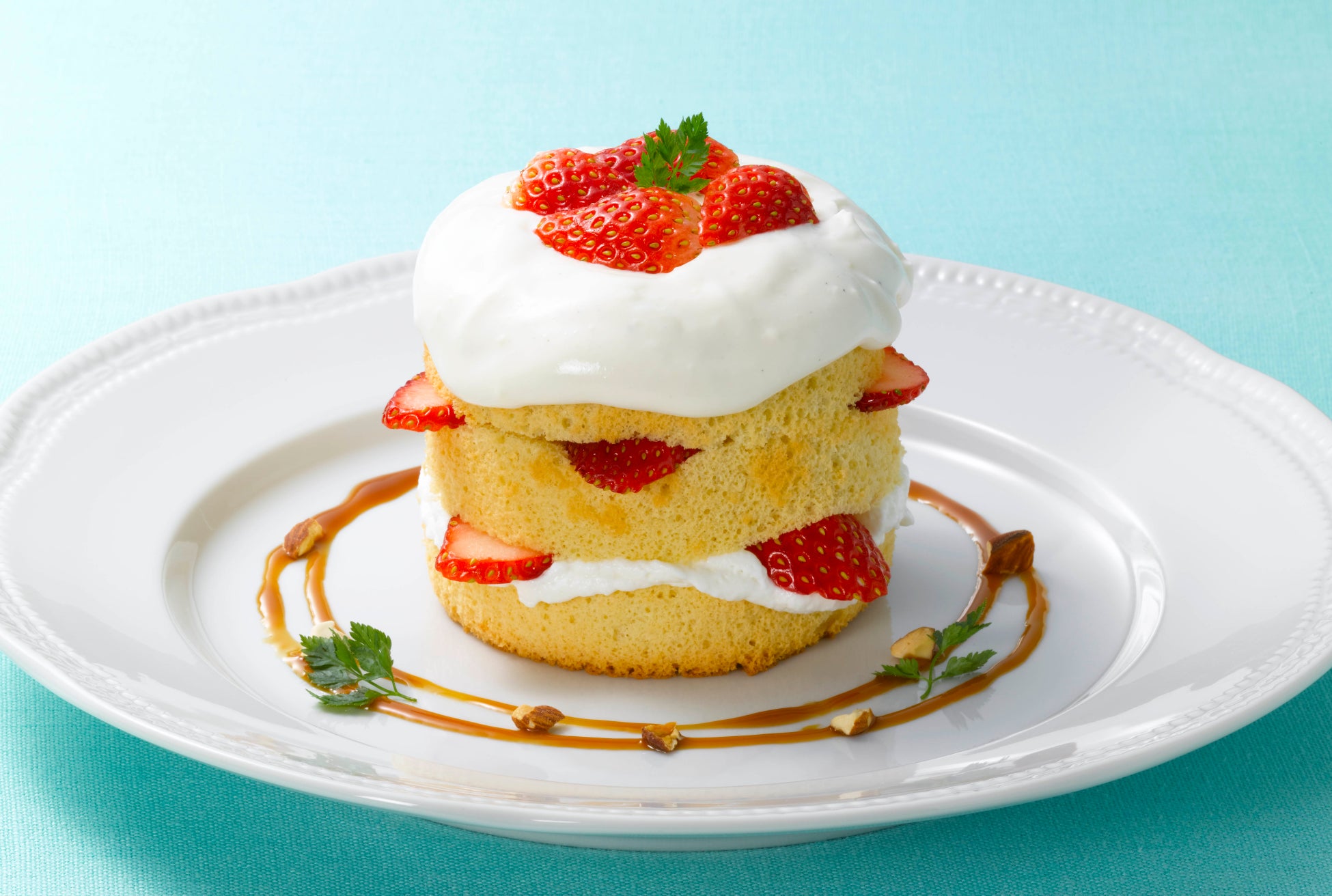 少し小さめの自社製ホールシフォンケーキに苺をサンドし、カスタード入りのホイップクリームをのせた、優しい味わいのショートケーキです。ホールのままショートケーキを味わう醍醐味をお楽しみいただけます。