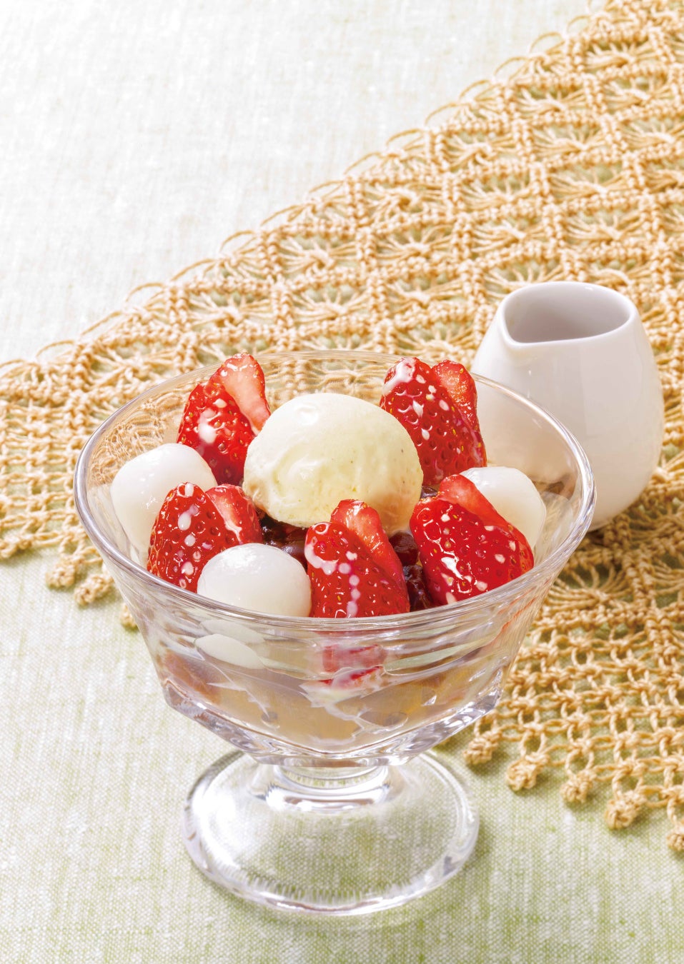 苺、十勝あずき、喉ごしの良い寒天に白玉を添えて、もちもちの食感が楽しめるクリームあんみつです。黒みつを添えています。