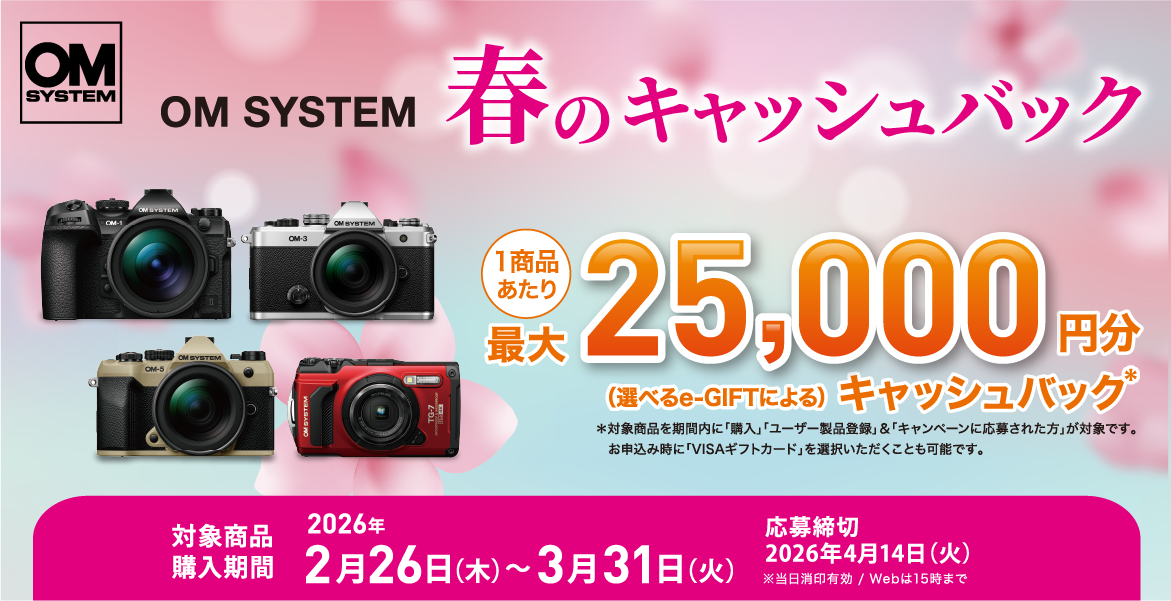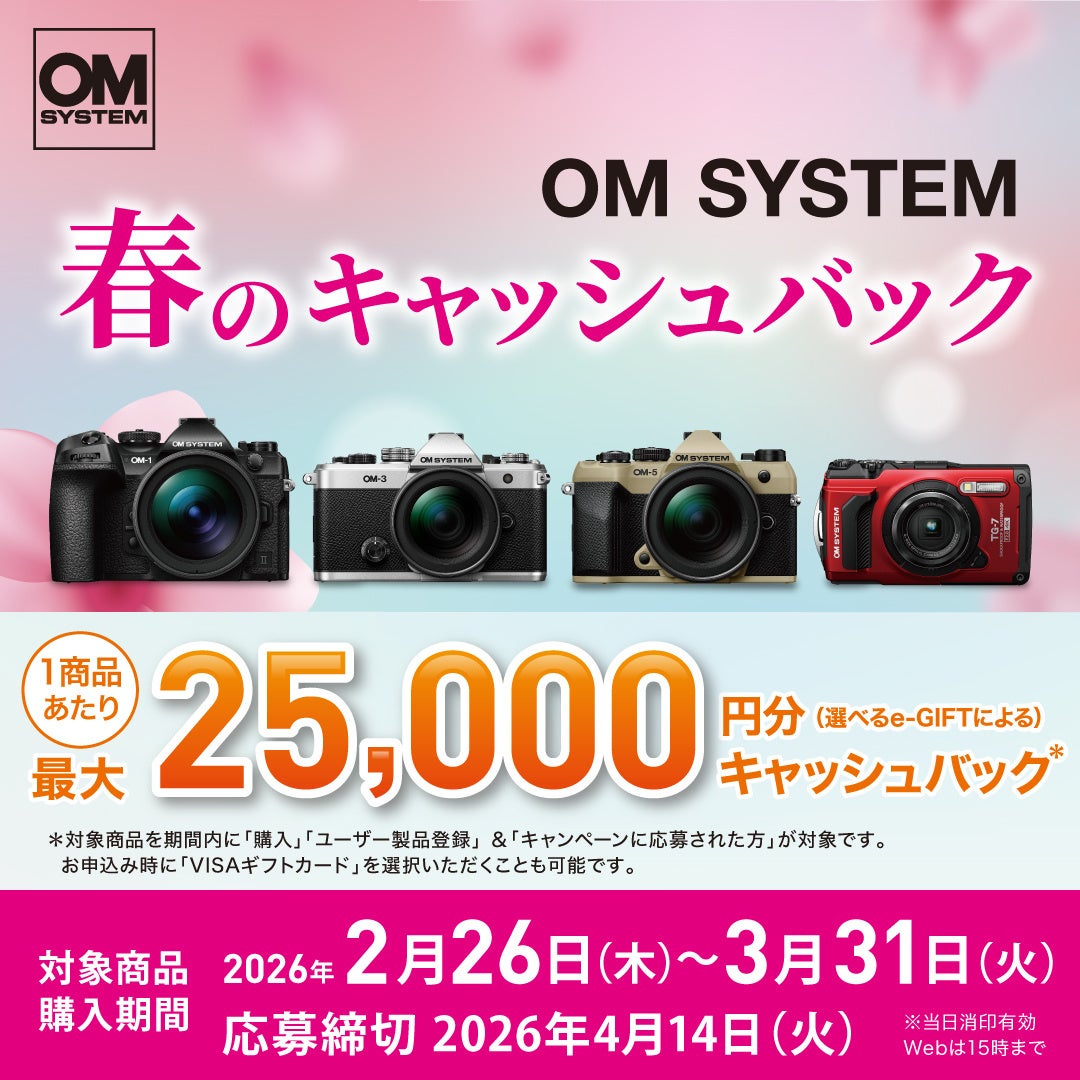 OMデジタルソリューションズ株式会社が展開する映像製品ブランド「OM SYSTEM」は、対象のミラーレス一眼カメラ(レンズキットを含む)、およびコンパクトデジタルカメラをご購入いただいたお客さまを対象に、1商品あたり最大25,000円分の「選べるe-GIFT」をプレゼントする『OM SYSTEM 春のキャッシュバック』キャンペーンを2026年2月26日(木)より実施します。