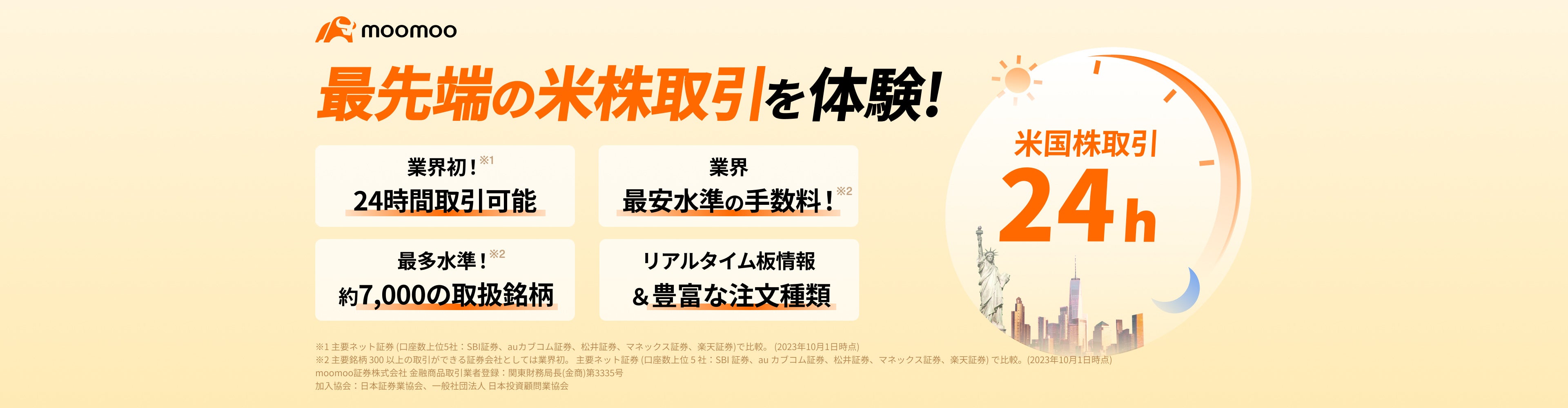 *3 24時間取引可能銘柄は、moomoo証券Webサイト(https://www.moomoo.com/jp/support/topic7_135?lang=ja&from_platform=4&platform_langArea=jp)にてご確認いただけます。また、24時間取引可能銘柄数は順次拡大予定です。
