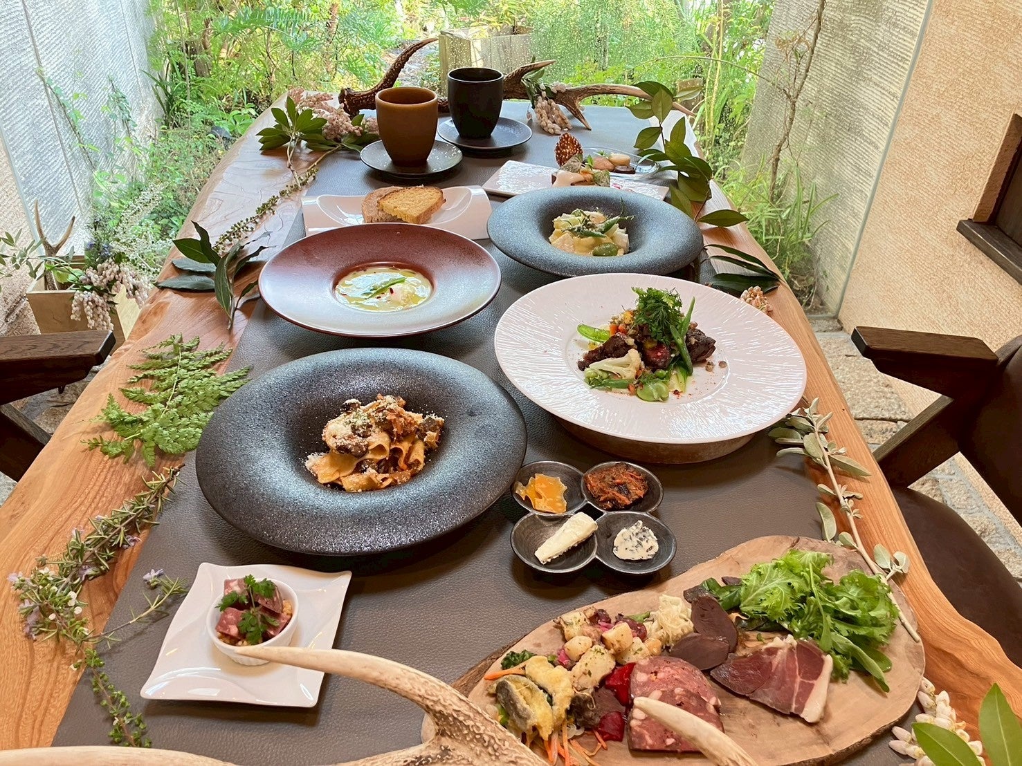 新鮮なジビエを使用し、自家栽培や契約農家からの季節のこだわり食材をふんだんに使用したディナーコースです。