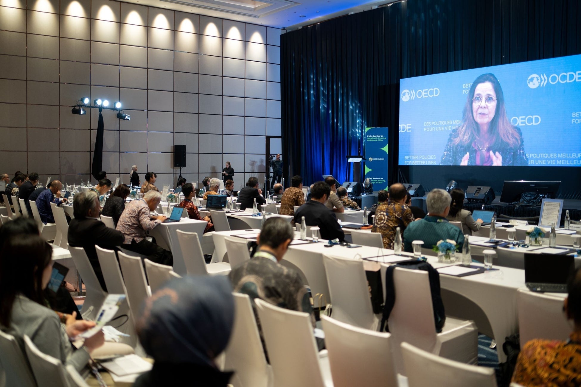 インドネシア住宅・居住地域省、日本建築センター、ERIA(東アジア・アセアン経済研究センター)、JUBH(一般社団法人 国際住宅建築都市産業協会)、OECD(経済協力開発機構)の共催で開催されました。OECDプロジェクトの成果を紹介し、日本やその他OECD諸国のベストプラクティスや政策イニシアチブについて講演やパネルディスカッションを通じて共有することで、インドネシア都市における持続可能な住宅、建築、都市政策の推進を目的としています。日本およびインドネシアの政府関係者や民間企業、学術関係者などが参加しました。