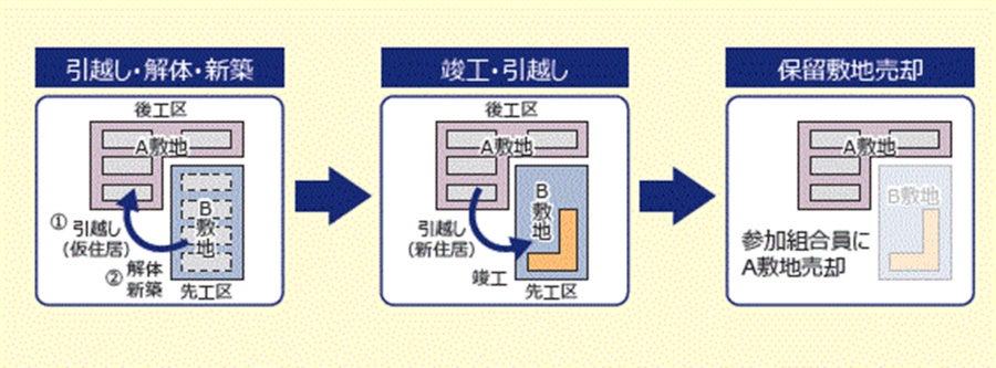 本件の建替えにあたり、住戸数232戸の建替えにかかる引越し・仮住まいの負担を軽減するために、本件敷地をA敷地・B敷地に分けて段階的施工の方式を取ります。先工区としてB敷地のみ解体を行い、A敷地の空き住戸を仮住まいに充てることで、団地外への仮住居を無くし又は最小限に抑えること、また解体・新築工期を短くすることで、仮住まい期間や事業全体の期間を短縮し、区分所有者の皆様の経済的・精神的負担軽減を図ります。また後工区のA敷地を「保留敷地」として参加組合員に売却することで、マンション建替事業の早期完了、建替組合の早期解散を実現します。これにより、