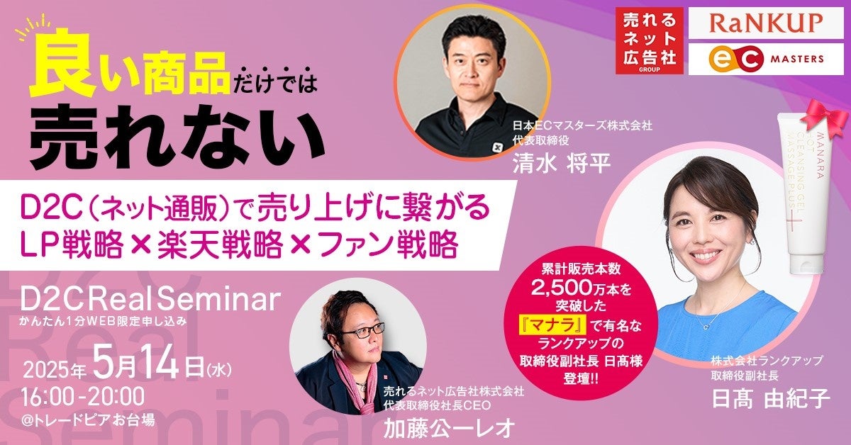 売れるネット広告社株式会社(本社:福岡県福岡市、代表取締役社長CEO:加藤公一レオ、東証グロース市場:証券コード9235、以下 売れるネット広告社)は、2025年5月14日(水)に、『良い商品だけでは売れない~D2Cで売上に繋がるLP戦略×楽天戦略×ファン戦略~』セミナーを開催いたします。
