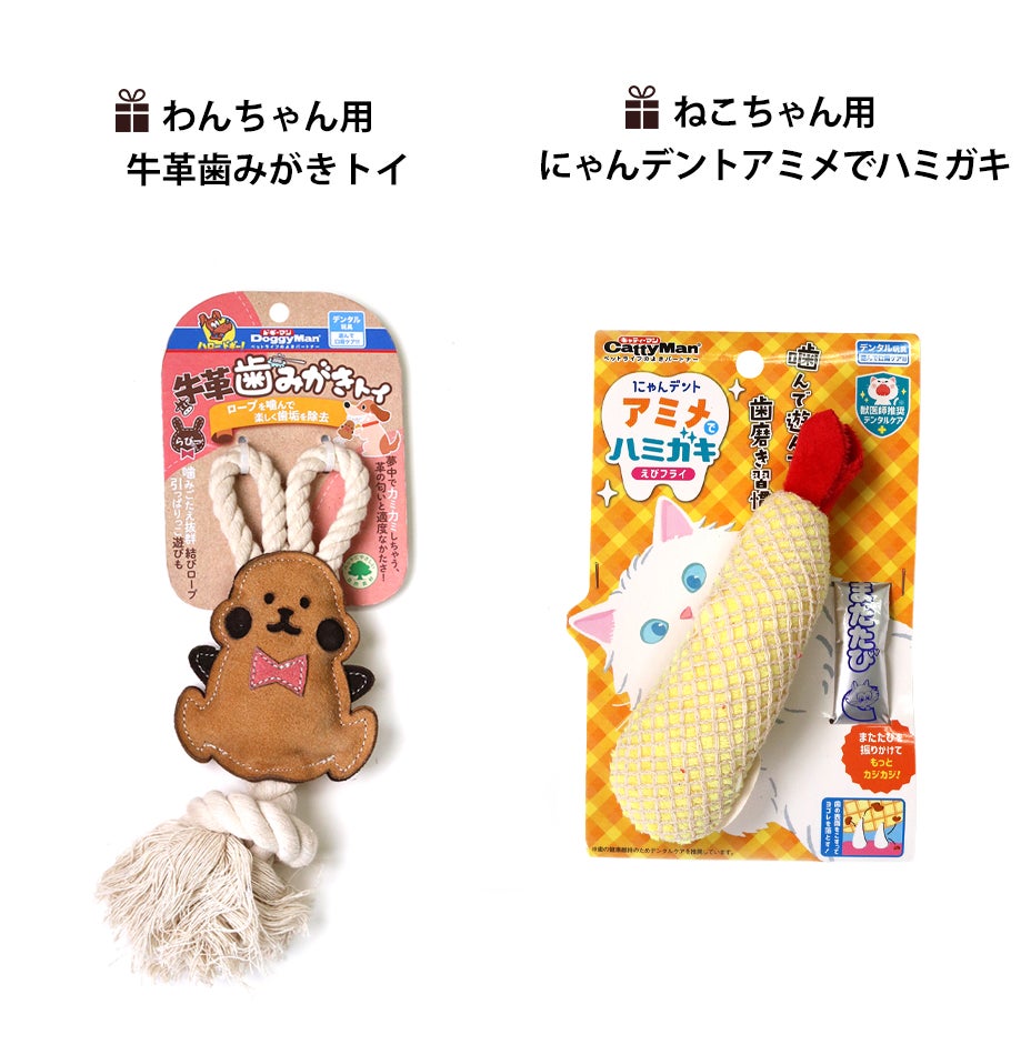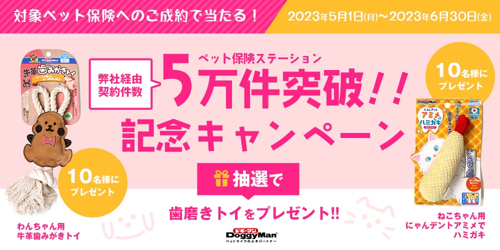 期間中にペット保険ステーション経由で対象保険会社へお申込みいただき、ご成約いただいた方の中から抽選で各10名様に「ドギーマン わんちゃん用・ねこちゃん用歯みがきトイ」をプレゼント。