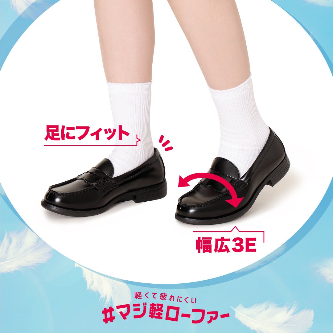 マジ軽ローファーは、メンズの重さが270gで従来モデルより25%の軽量化、レディースの重さは190gで従来モデルより24%も軽量化に成功。毎日通学で履くローファーならではの悩みの1つの重さの軽減を実現。
