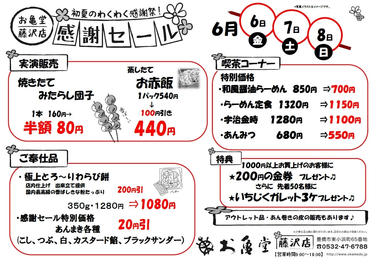 愛知県三河地方で70年以上親しまれている老舗和菓子店・株式会社お亀堂(本社:愛知県豊橋市/代表取締役:森貴比古)は、藤沢店にて6月6日(金)〜8日(日)の3日間限定で「感謝セール」を開催いたします。