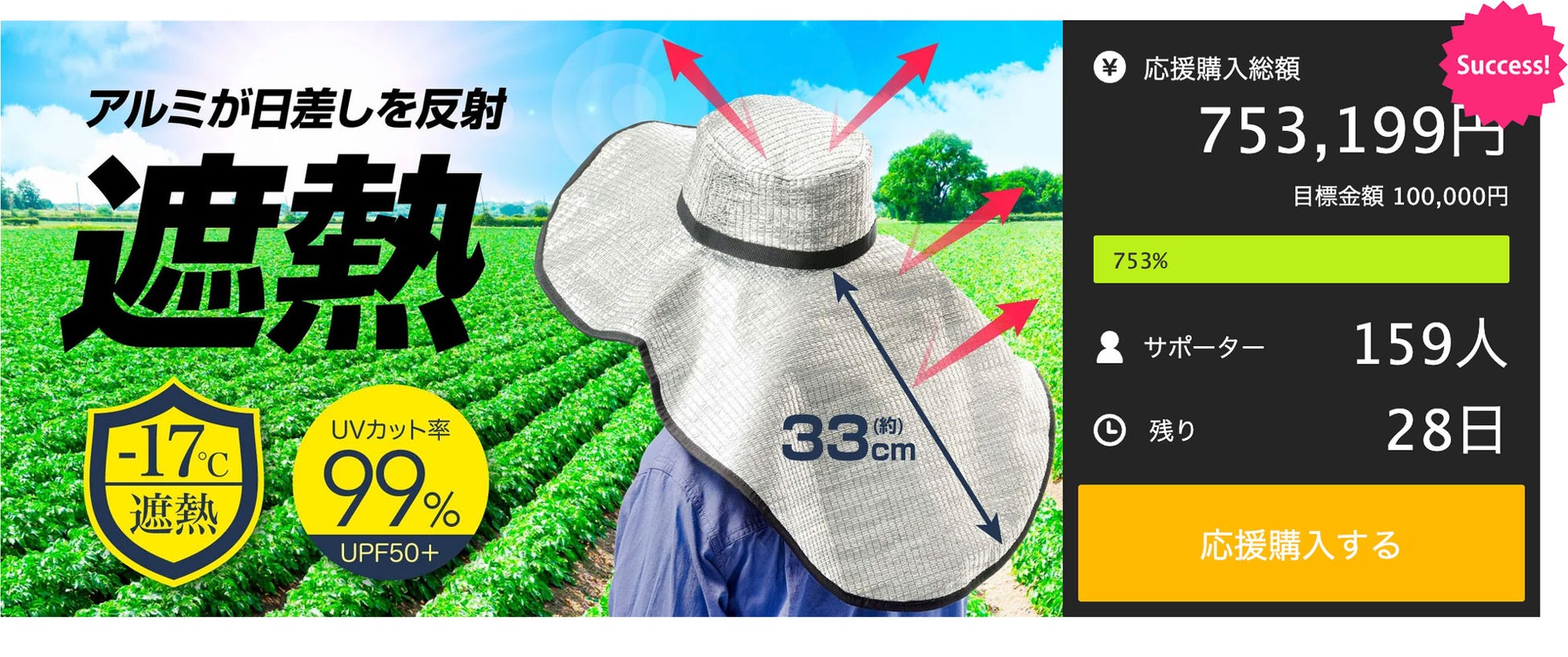猛暑を乗り切れ!アルミが熱と紫外線をシャットアウト!顔から背中までガードする「アルミでがっつり遮熱 ビッグつば広帽子」をMakuake(マクアケ)にて大好評700%達成しました!