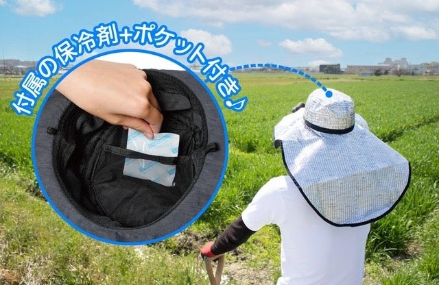 - 保冷剤と保冷剤が入るポケット付きで炎天下でも頭がひんやり!