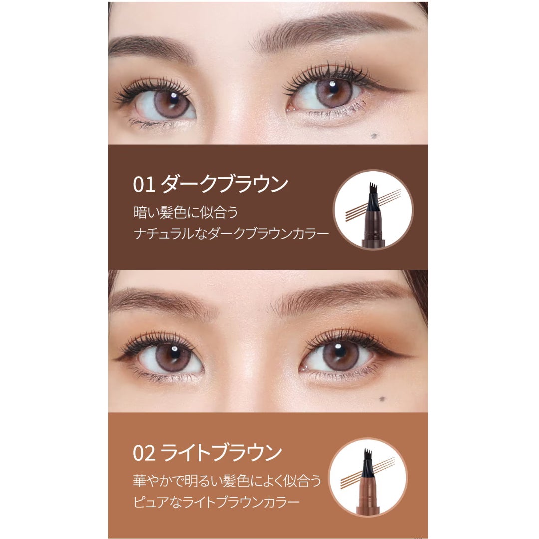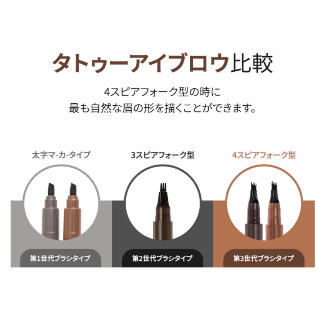 特徴:4スピアフォークブラシでさっと描け、眉毛のタトゥーの専門家が描いたようなプロが仕上げたナチュラル眉毛へ、すっぴんも堂々と自信あり!最大10日までの持続力