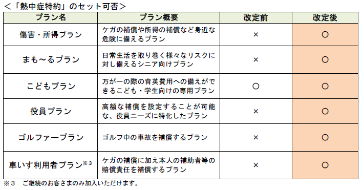 このような環境において、お客さまの不安を少しでも軽減するために、損保ジャパンは「THE カラダの保険」のすべてのプランに「熱中症特約」をセットできるように改定します。