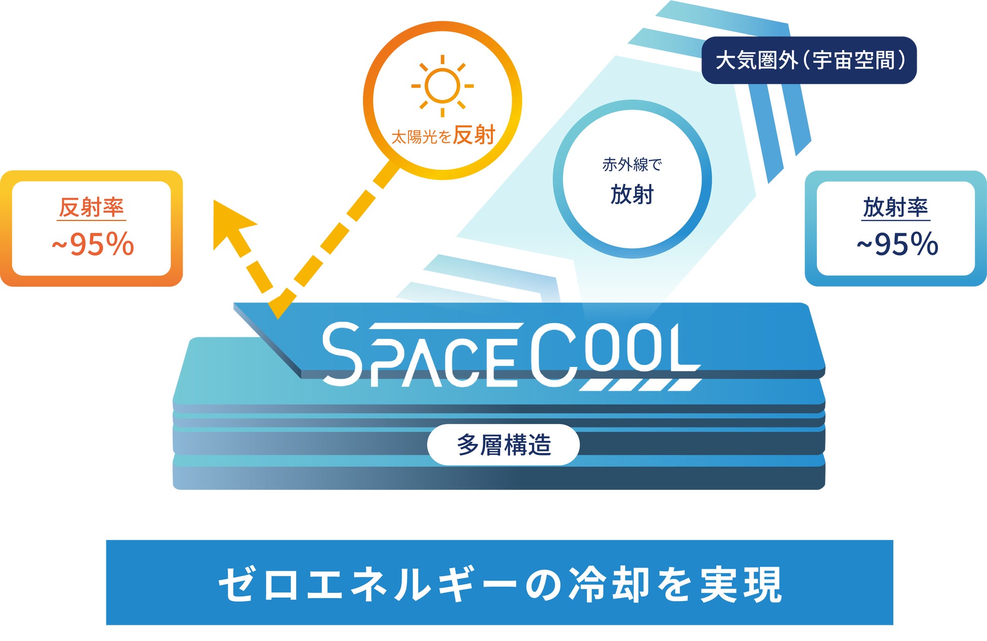 直射日光下において、太陽光からの熱をブロックし熱吸収を抑えるだけでなく、熱を「大気の窓⁽*⁾」の波長域の赤外線として宇宙に逃がすことで、ゼロエネルギーで外気温よりも温度低下することを可能にした世界最高レベルの放射冷却性能を持つ新素材です。