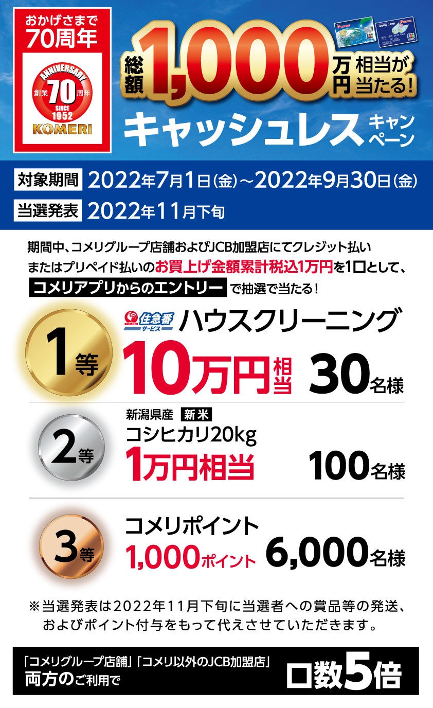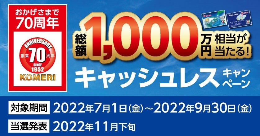 コメリは本年で創業70周年を迎えました。そこで、日ごろからお世話になっているお客様に感謝の気持ちを込め、総額1,000万円相当が当たる、コメリカード・アクアカード会員様限定のキャッシュレスキャンペーンを開催いたします。