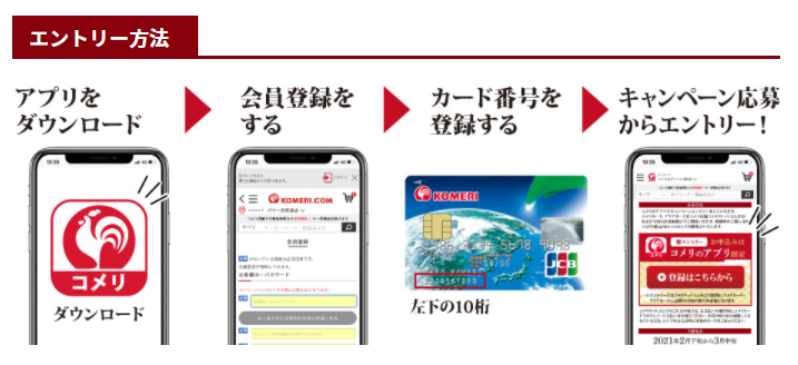 期間中、コメリのアプリからエントリーしていただき、「コメリグループ店舗」および「コメリ以外のJCB加盟店」にてクレジット払いまたはプリペイド払いをしていただくと、お買上げ金額 累計税込1万円を1口としてご応募いただけます。また、「コメリグループ店舗」および「コメリ以外のJCB加盟店」両方をご利用いただくと応募口数が5倍となります。