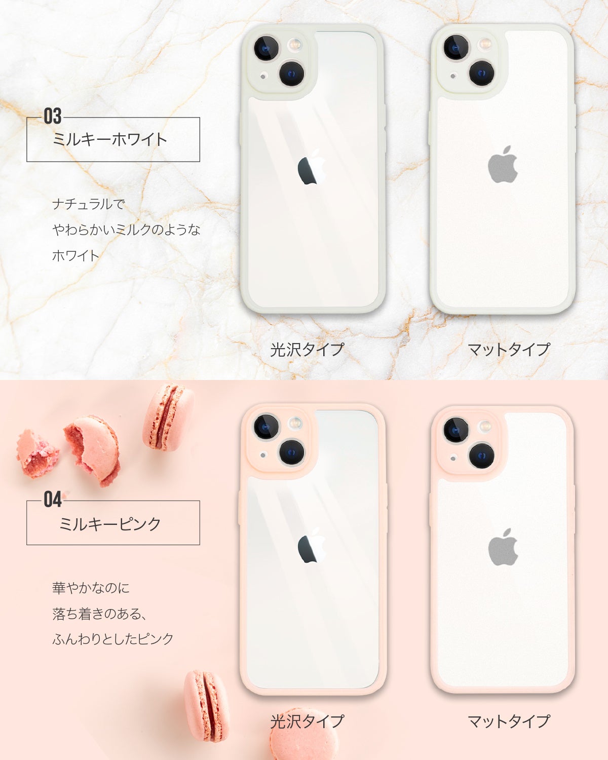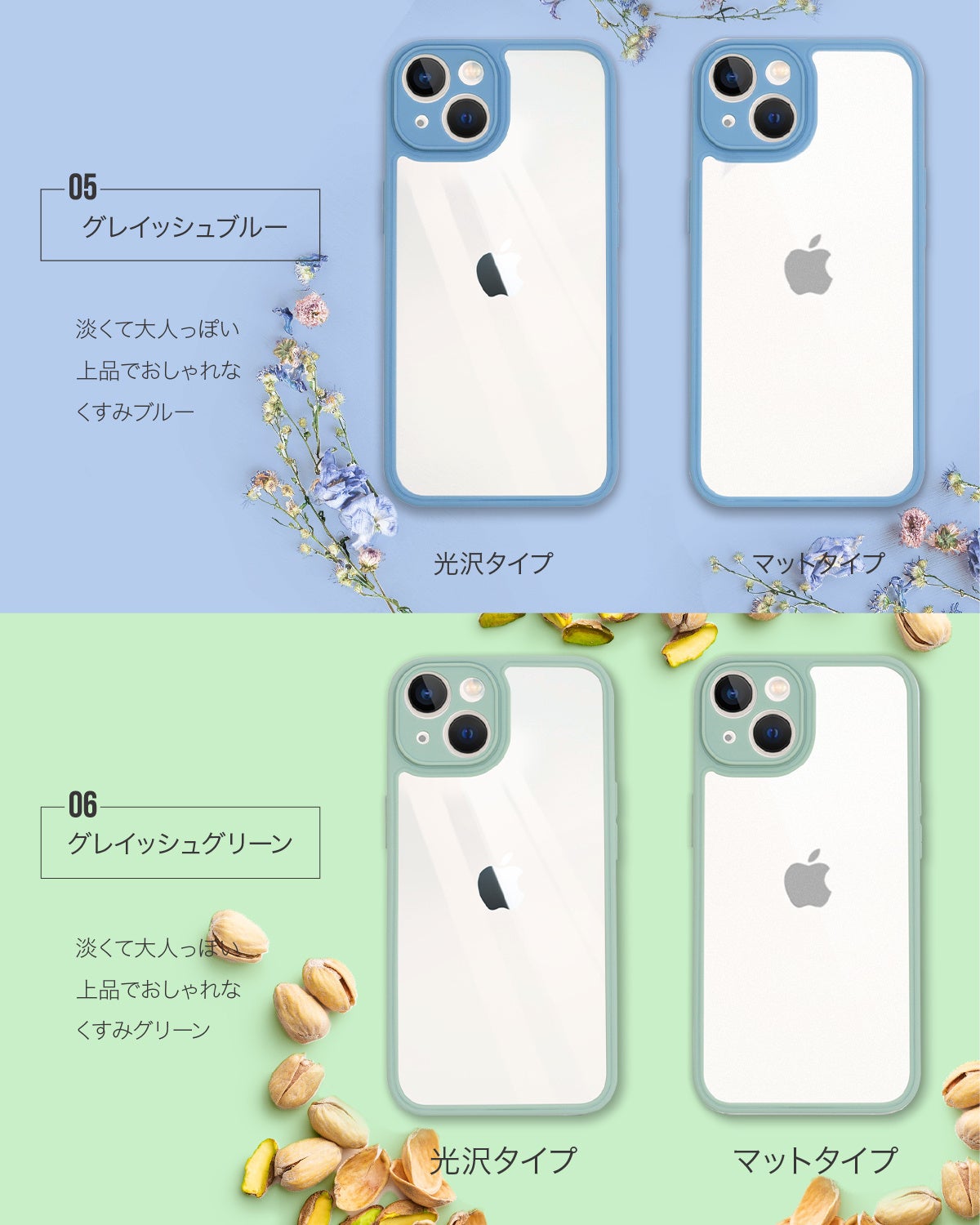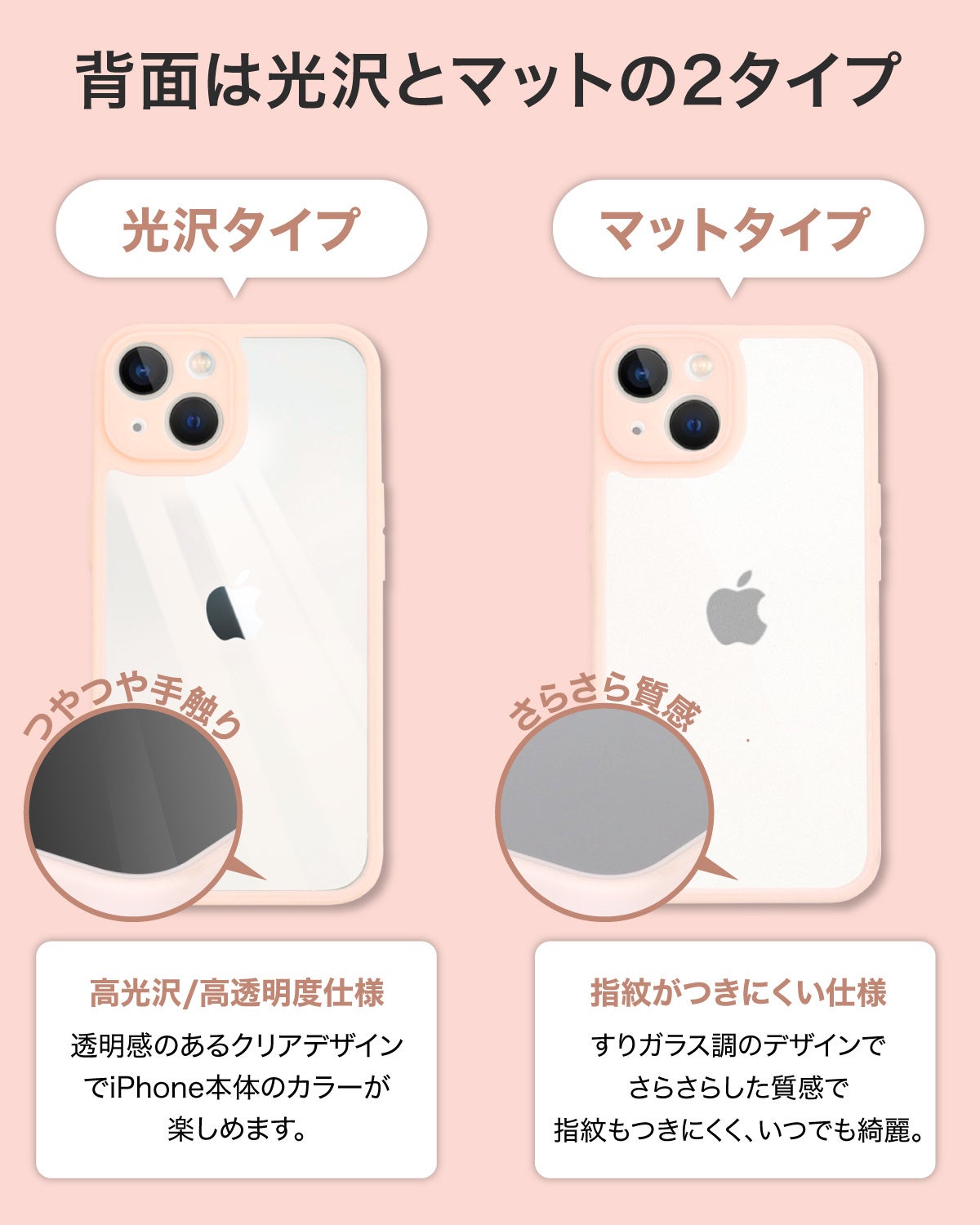 iPhone14 / iPhone13 / iPhone12 シリーズに対応。背面の透明部分は「光沢」と「マット」から選べ、カラバリは8色展開です。◎楽天スーパーSALE限定特別価格で販売