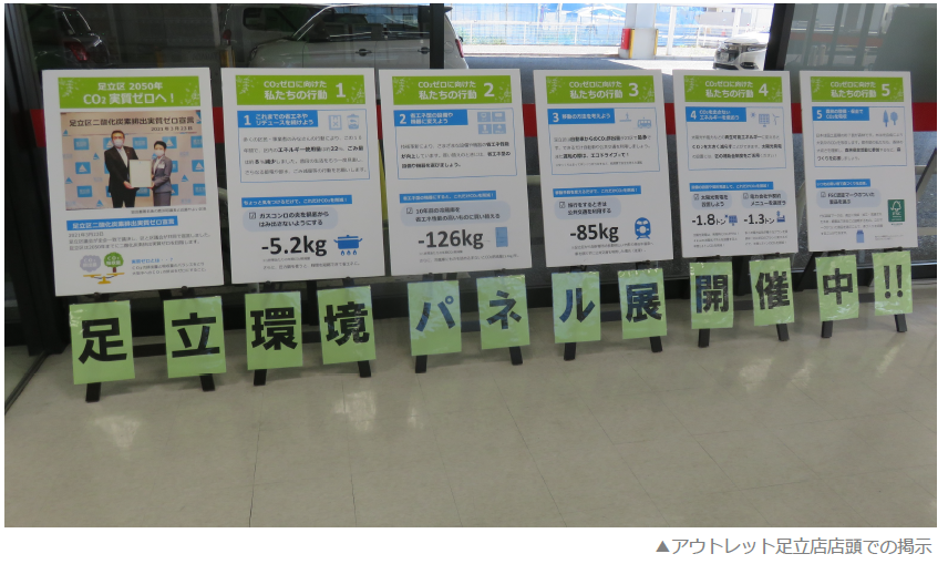株式会社ヤマダホールディングス(本社:群馬県高崎市、代表取締役会長 兼 社長 CEO:山田 昇、以下、ヤマダホールディングス)は、東京都足立区の「足立区二酸化炭素排出実質ゼロ宣言」に賛同、また、同区役所からの要請を受け、株式会社ヤマダデンキ(本社:群馬県高崎市、代表取締役社長:上野 善紀、以下、ヤマダデンキ)が展開する同区内の「テックランド足立店※1」「アウトレット足立店※2」の店頭において、「CO2ゼロに向けた私たちの行動」パネル等の掲示に協力しました。
