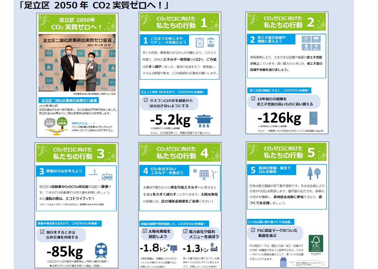 東京都足立区議会は2021年3月23日に、2050年までにCO2排出実質ゼロを目指すことを全会一致で議決し、区と区議会が共同で「足立区二酸化炭素排出実質ゼロ宣言」を宣言しています。