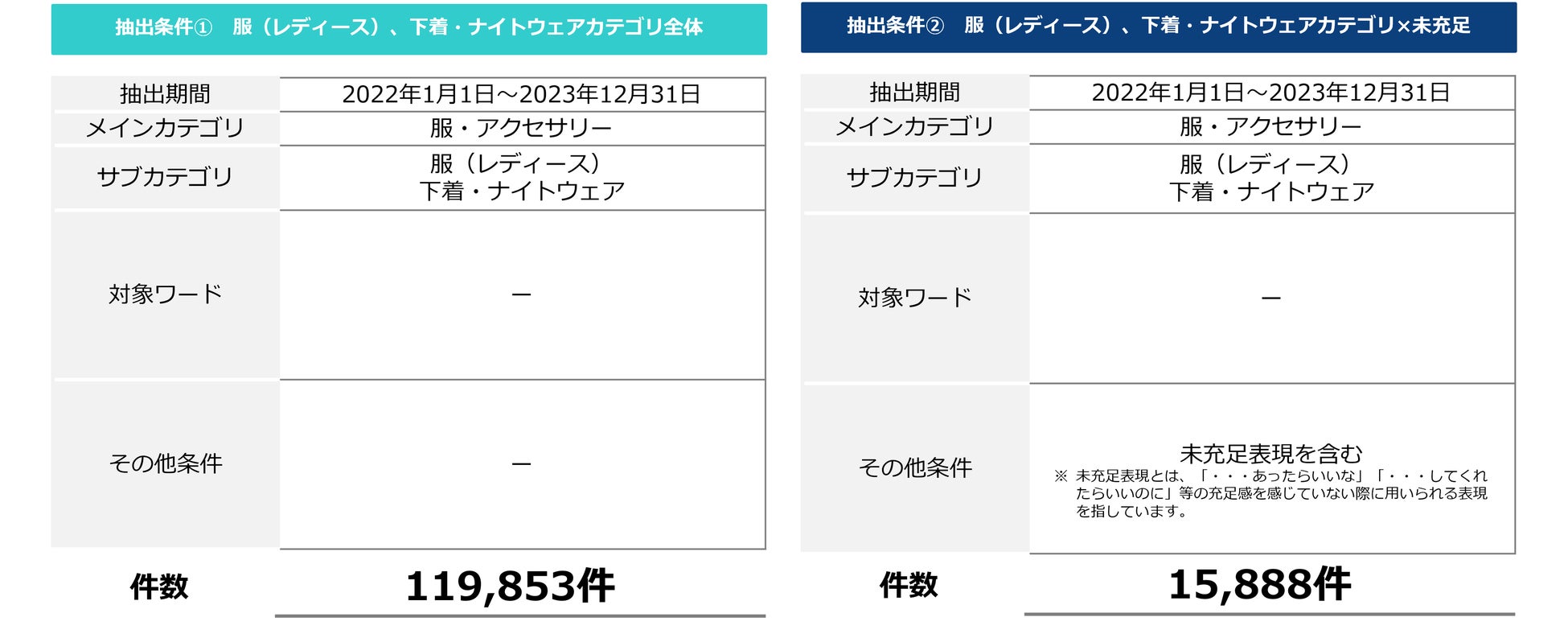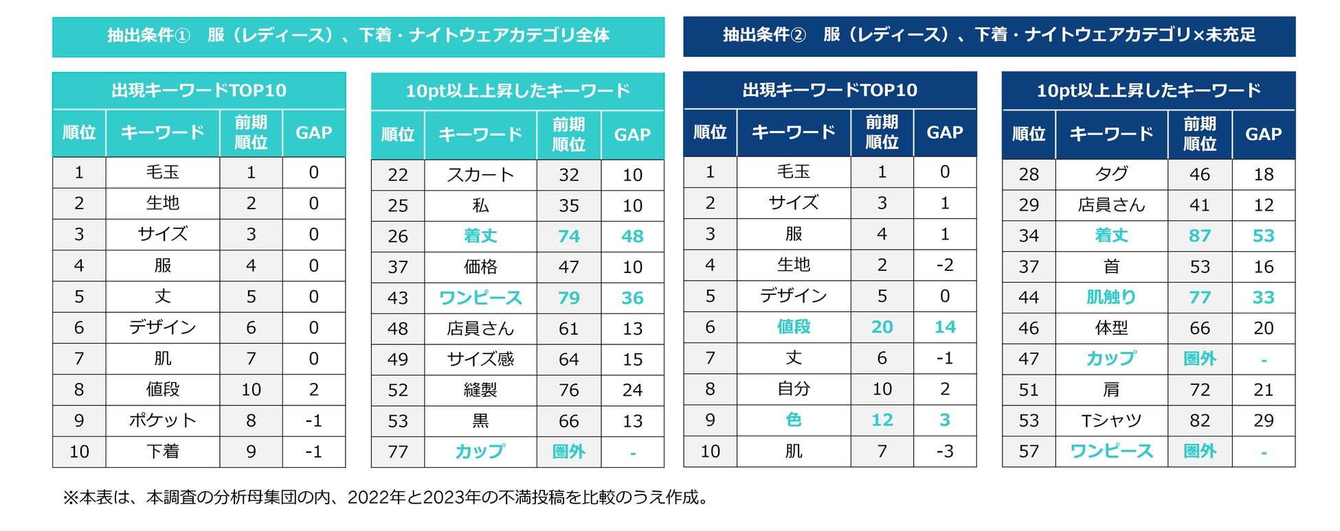 抽出条件①と②の出現キーワードを確認した。 Top10の内容はほぼ同様だが、未充足のランキングでは「値段」「色」がランクイン。 10pt以上上昇したワードは「着丈」「肌触り」「ワンピース」「カップ」などのワードが上昇。