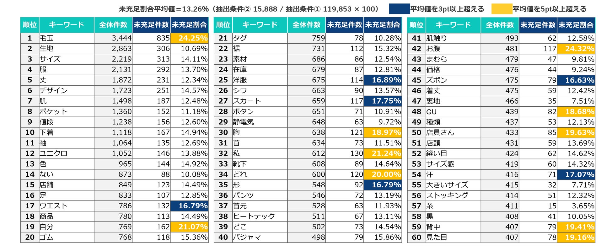 抽出条件①のキーワードランキングをベースに、キーワードの全体件数に対する未充足件数の割合を確認した。 「毛玉」「自分」「胸」「私」「どれ」「お腹」「GU」「店員さん」「背中」「見た目」未充足割合平均値を5pt以上上回る結果となった。