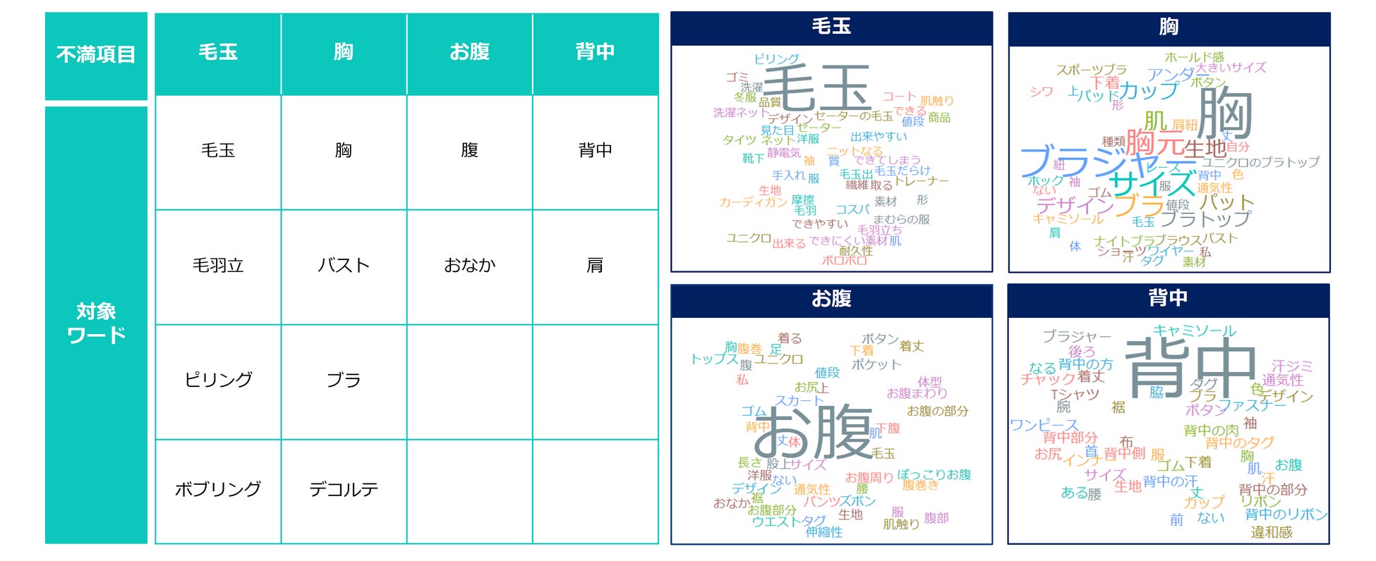 『不満ファインダー』のテキスト解析機能を用いて未充足割合が高いキーワードに関連する不満の原文を参照しながら、服・下着に対して抱いている不安や不満の特徴を整理しました。