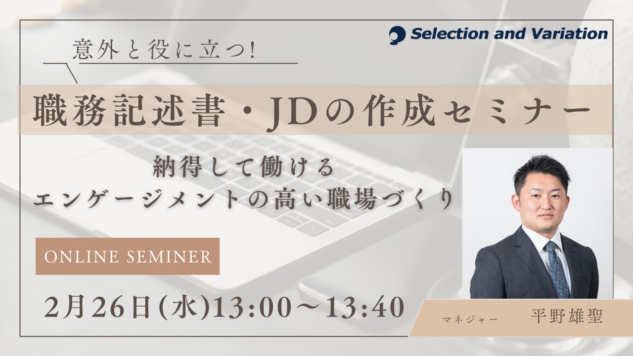 組織・人事コンサルティングファームであるセレクションアンドバリエーション株式会社(以下、当社、東京都千代田区丸の内、大阪市西区、名古屋市西区 / 代表取締役社長:平康慶浩/ URL:https://sele-vari.co.jp/ )は「意外と役に立つ職務記述書・JDの作成セミナー~納得して働ける、エンゲージメントの高い職場づくり~」セミナーを2025年2月26日(水)13:00〜13:40に開催することをお知らせいたします。
