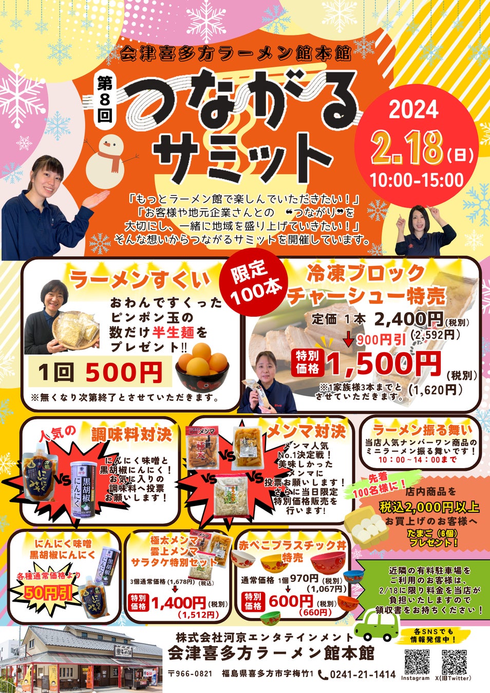 株式会社河京エンタテインメント 会津喜多方ラーメン館本館(本社:福島県喜多方市、取締役社長:土屋充孝)は、ブロックチャーシューの特売と河京工場直送のラーメンすくい、ご当地炊き込みご飯の素フェア、地元のお店の人気フード販売なども行う「第8回つながるサミット」を2024年2月18日(日)に開催致します。