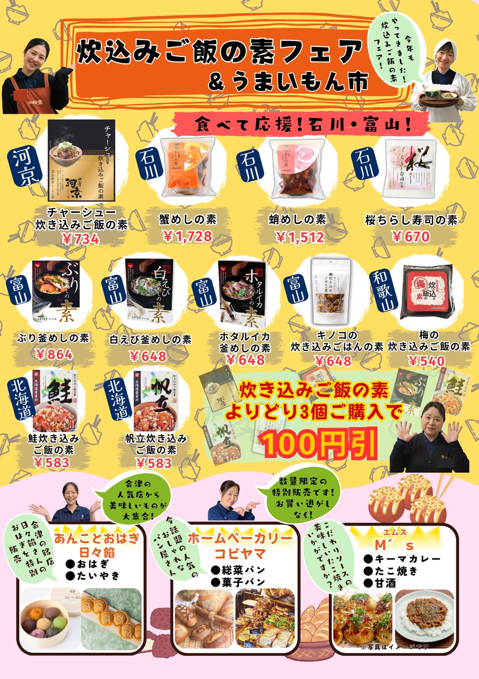 自家製チャーシューの特別販売、工場直送ラーメンすくい、ご当地炊き込みご飯の素フェアなどイベントが盛りだくさん!