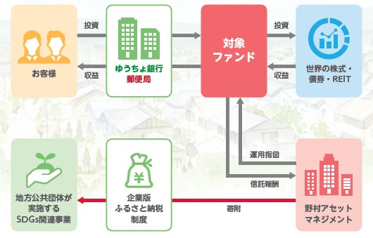 当プロジェクトは、当社が運用し、ゆうちょ銀行および投資信託を取り扱う郵便局が販売する「野村世界6資産分散投信(安定コース)(分配コース)(成長コース)(配分変更コース)」から当社が得る収益の一部を、地方創生応援税制(以下「企業版ふるさと納税」)の仕組みを活用して寄附するものです。