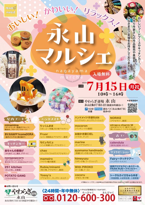 やわらぎ斎場 永山では地域のハンドメイド作家の皆様と協力し、ハンドメイドマルシェを7月15日(日)に開催。手作り作家さんの作品販売や、リラクゼーション体験、占い、グルメなど様々なブースが出店いたします。