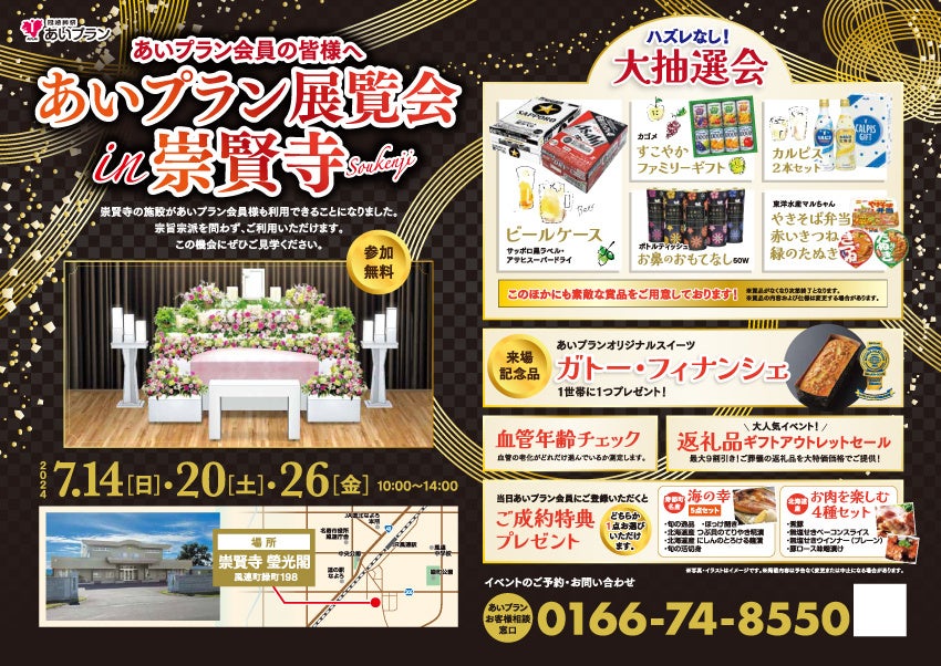 あいプランのご葬儀で新たにご利用いただけるようになった、崇賢寺の施設をご見学いただけます。大抽選会や返礼品アウトレットセール、血管年齢チェックなど楽しい企画も。