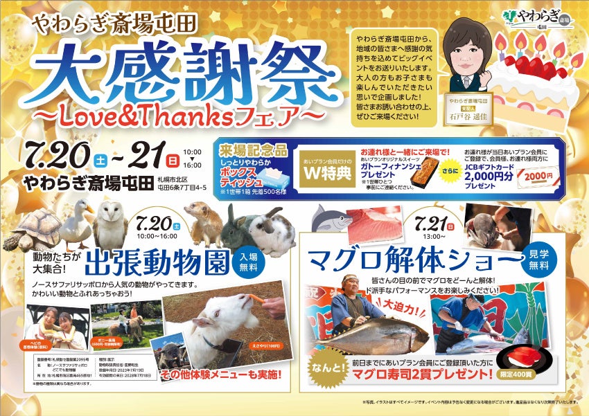 7月20日(土)~21日(日)に開催のやわらぎ斎場 屯田「大感謝祭 Love&Thanksフェア」では、周年を記念して出張動物園やマグロの解体ショーを開催。キッチンカーも集まり、人気のグルメ販売もございます。小さなお子様から年配の方まで、ご家族でお楽しみください。