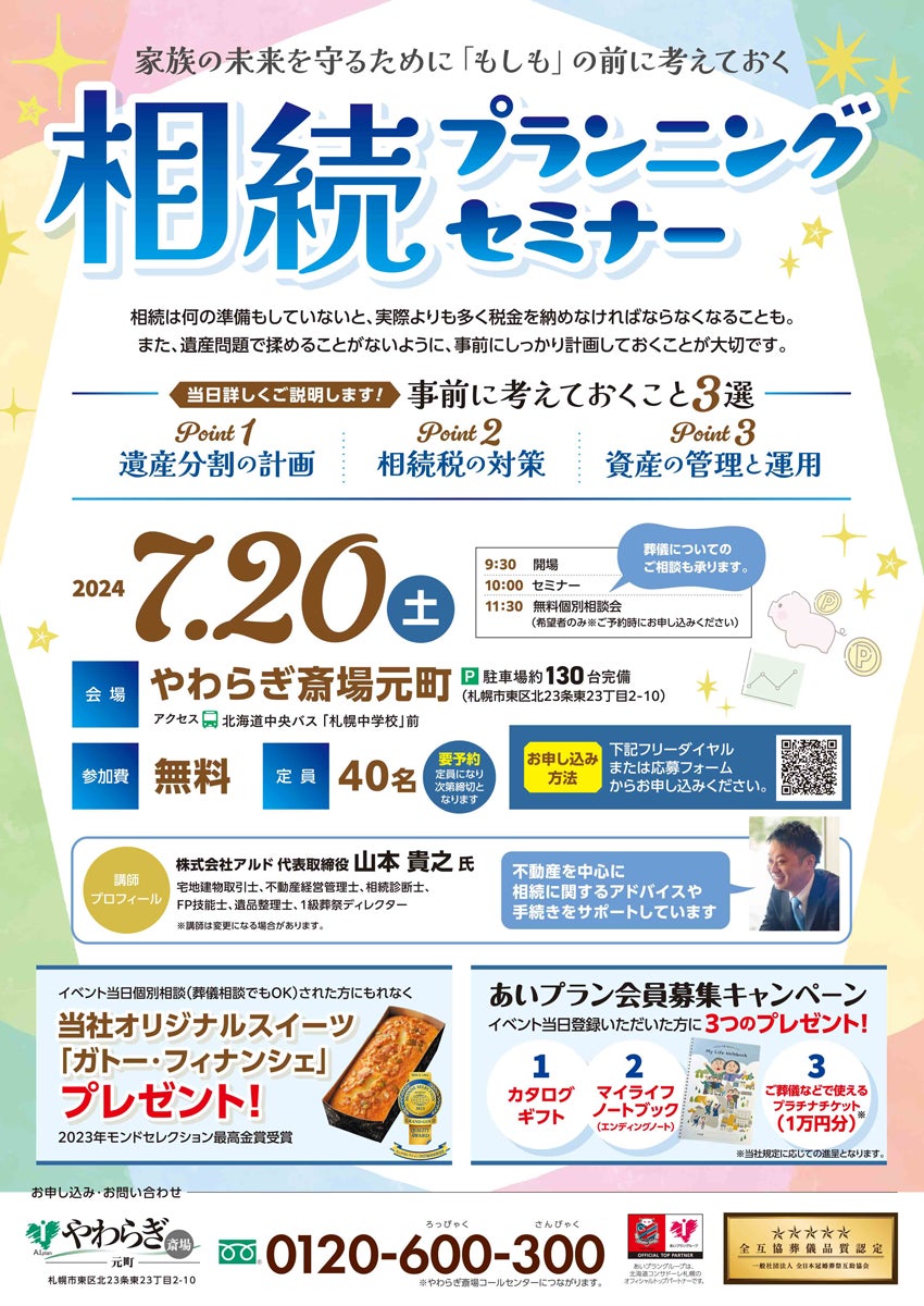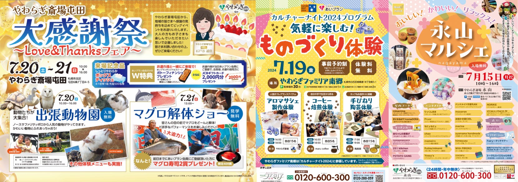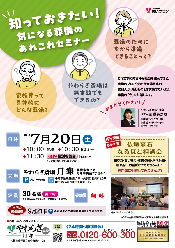 株式会社あいプラン(北海道札幌市)のやわらぎ斎場 では、7月も様々なイベントを開催しております。各所それぞれ個性的なイベントを行っておりますのでお気軽にお越しください。