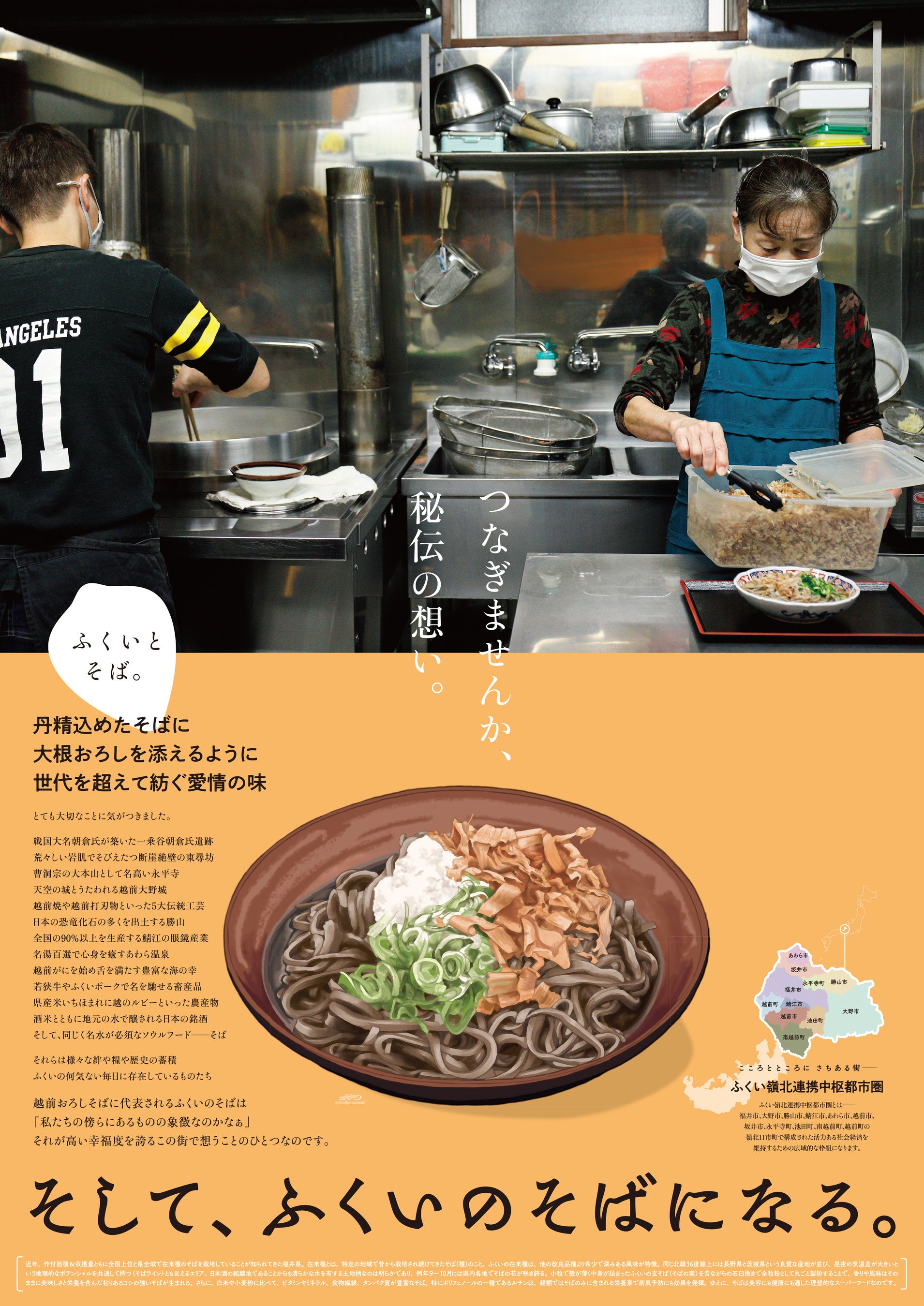 このたび、福井市は、(株)LDH JAPANとの地域活性化連携協定に基づき、ふくい嶺北連携中枢都市圏の特産物『在来種そば』のPRとして、福井市食のPR大使橘ケンチ氏(EXILE/EXILE THE SECOND)が登場する新ビジュアルの『ふくいとそば。The Poster』第3弾を制作しました。