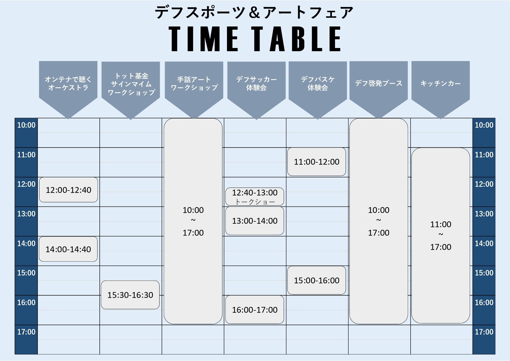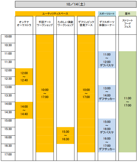 内容 | デフリンピック啓発ブース デフスポーツ体験コーナー オンテナで聴くオーケストラ たのしい演劇ワークショップ 手話アートのワークショップ ストリートフードフェスティバルなど |