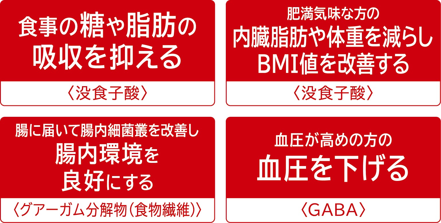 ●届出表示:本品にはグアーガム分解物(食物繊維)、没食子酸、GABAが含まれます。グアーガム分解物(食物繊維)には、腸に届いて腸内細菌叢を改善し、腸内環境を良好にする機能が報告されています。没食子酸には、食事の糖の吸収を抑え、食後の血糖値の上昇をおだやかにする機能、食事の脂肪の吸収を抑え、食後の中性脂肪の上昇をおだやかにする機能、肥満気味な方の内臓脂肪や体重を減らし、BMI値を改善する機能が報告されています。GABAには、血圧が高めの方の血圧を下げる機能が報告されています。