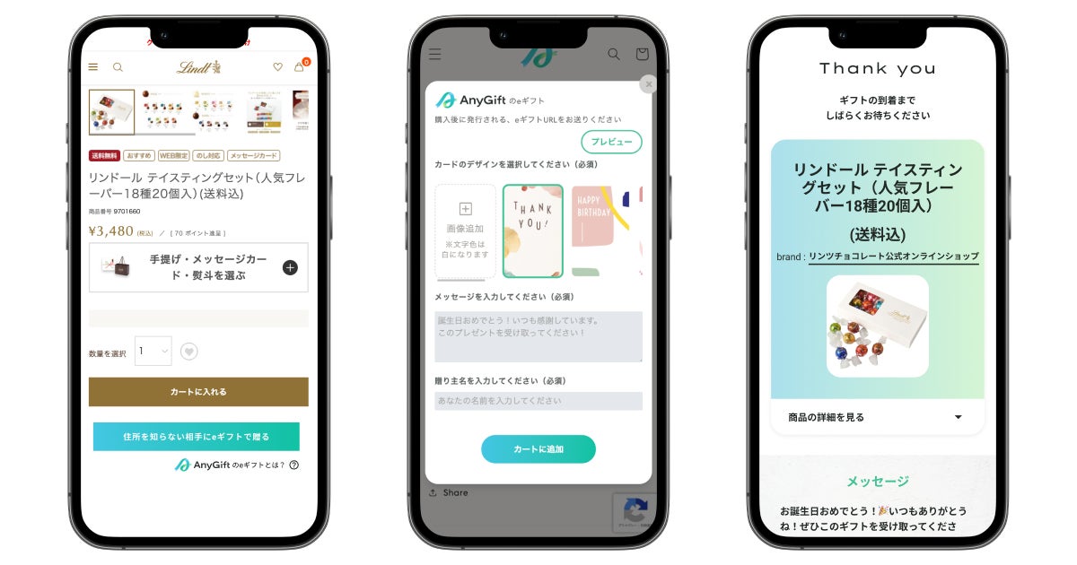 今回、当社のAnyGiftの提供により、「リンツ チョコレート 公式オンラインショップ」にて一部の商品がeギフトとして贈れるようになります。