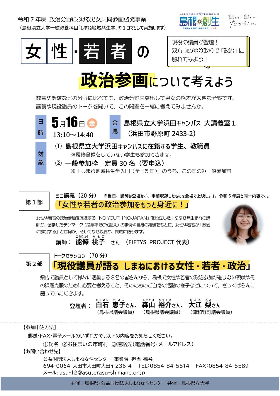 「女性・若者の政治参画について考えよう」を5月16日(金)に開催します【島根県立大学】
