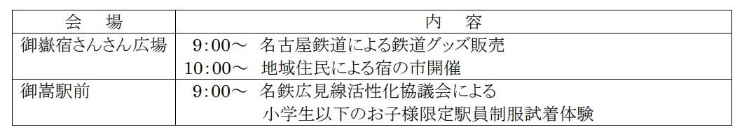 運行開始日は、御嵩駅にて発車式の実施と、駅前「御嶽宿さんさん広場」にて名鉄広見線活性化協議会等による各種イベント、当社による鉄道グッズ販売を行います。